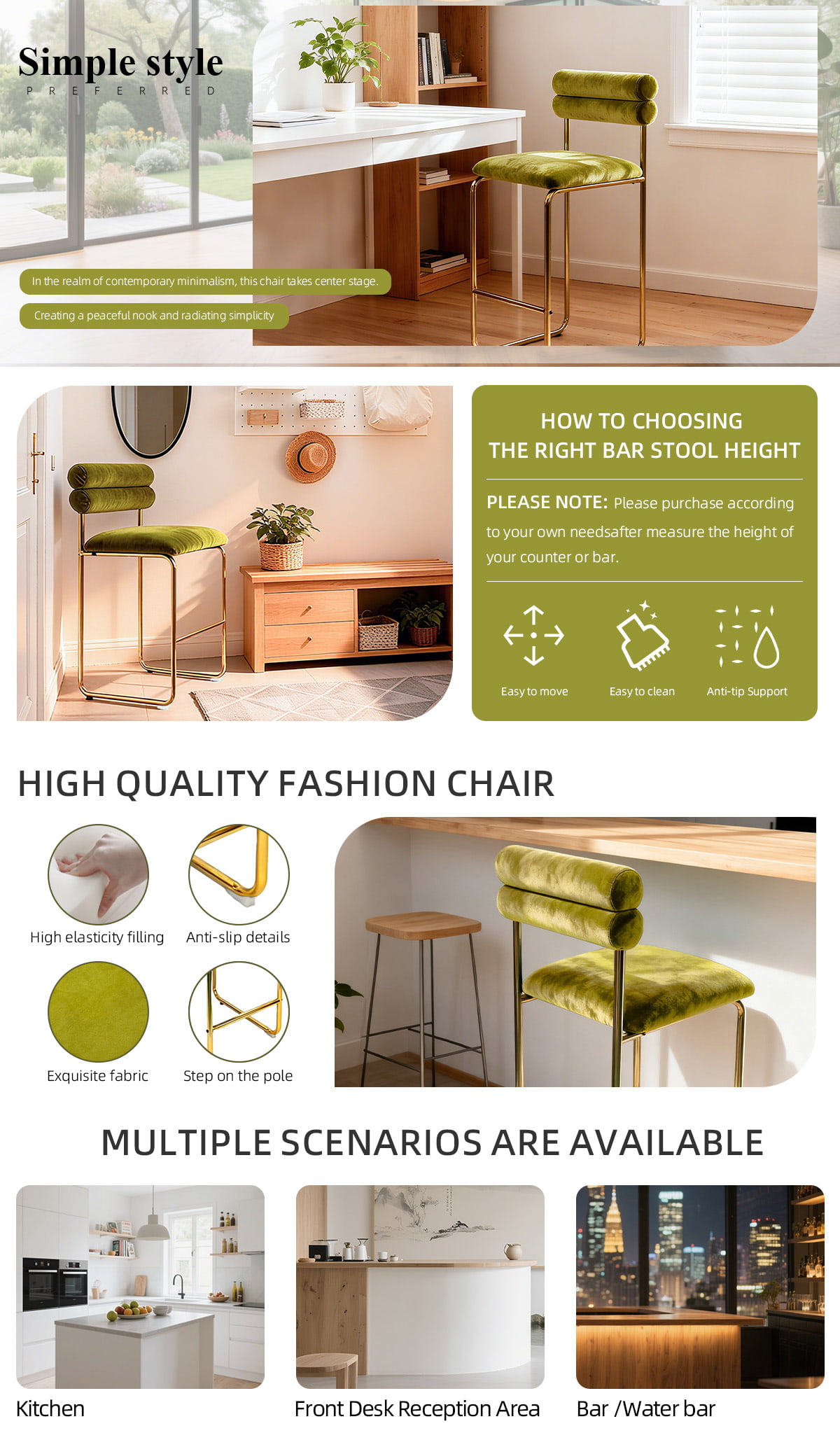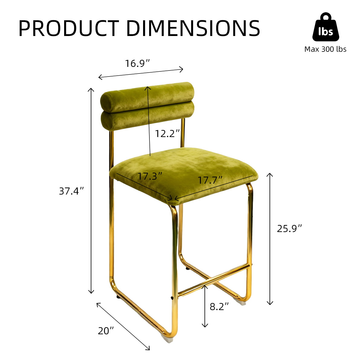 Its 37.4-inch height fits standard kitchen counters and dining bars, while the 25.9-inch seat ensures optimal comfort for long conversations or casual dining. The soft velvet upholstery offers a luxurious tactile experience, and the gold-plated legs add a refined touch. With a high-resilience foam cushion and anti-slip base, this stool is designed to combine comfort, style, and durability — perfect for both home and commercial spaces.
