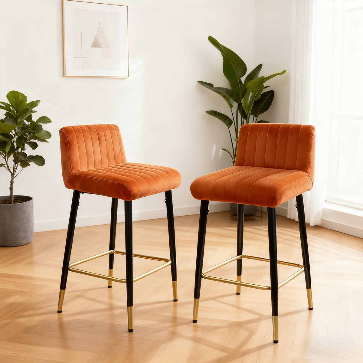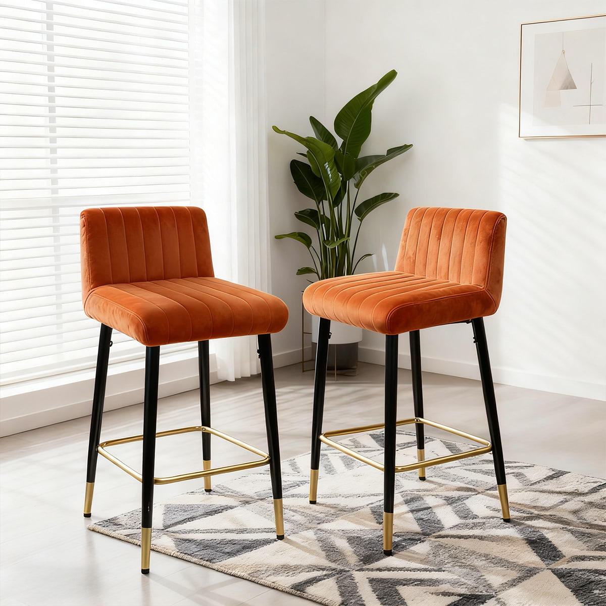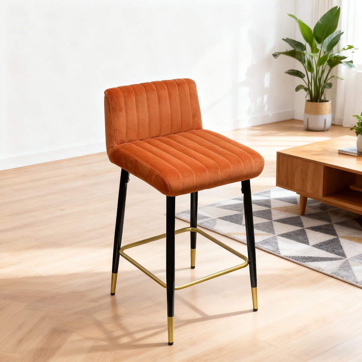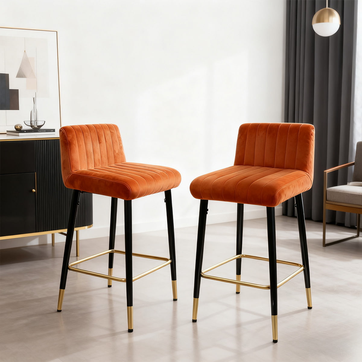 READ MOREAdd a touch of contemporary charm to your home with the DUOMEI Ochre Orange Velvet Swivel Bar Stool. Crafted for both style and comfort, this stool features plush velvet upholstery with vertical channel stitching that offers an inviting seat for any space. The 360° swivel function ensures flexibility, while the black metal frame with gold accents provides a sturdy base and luxurious finish.