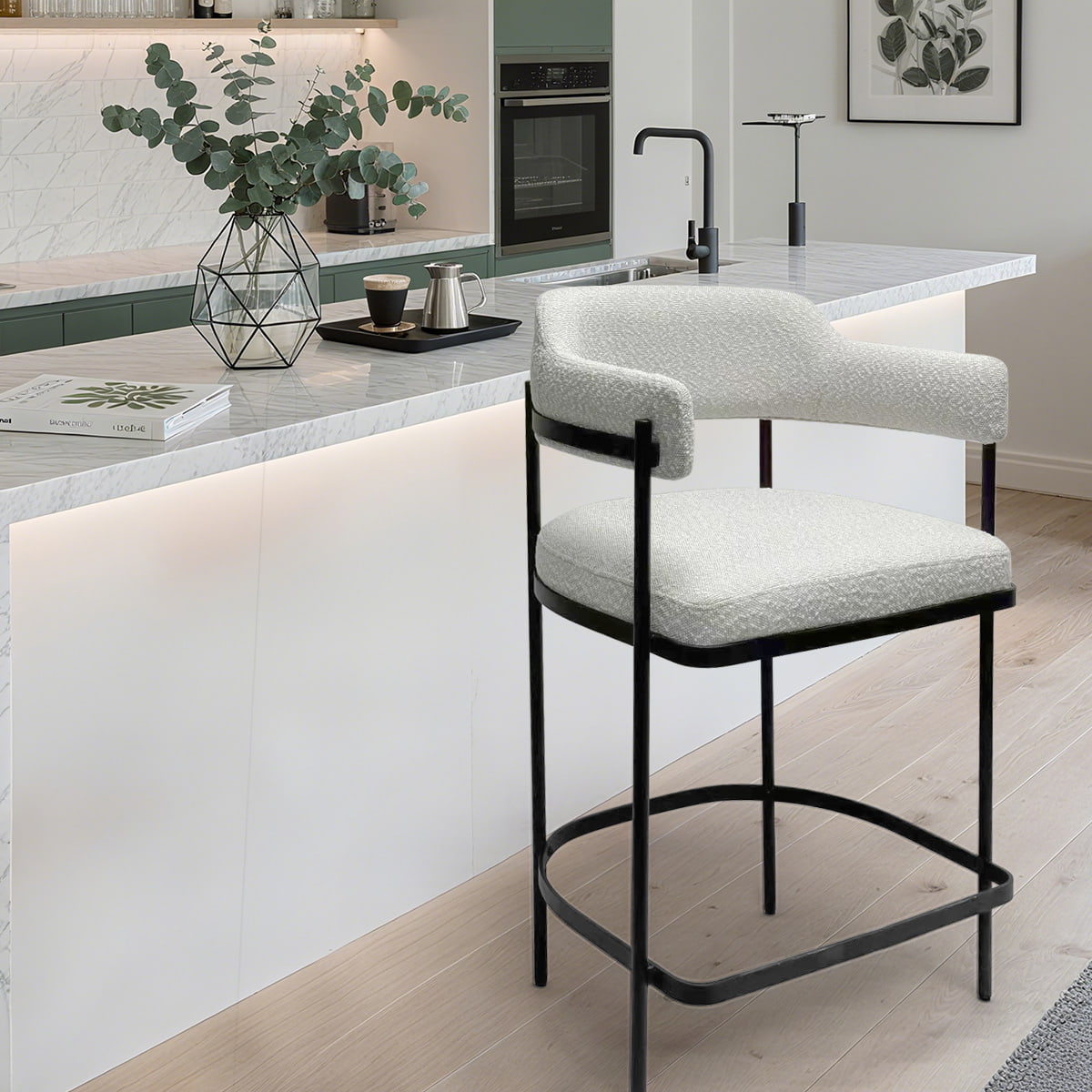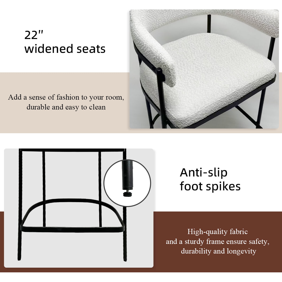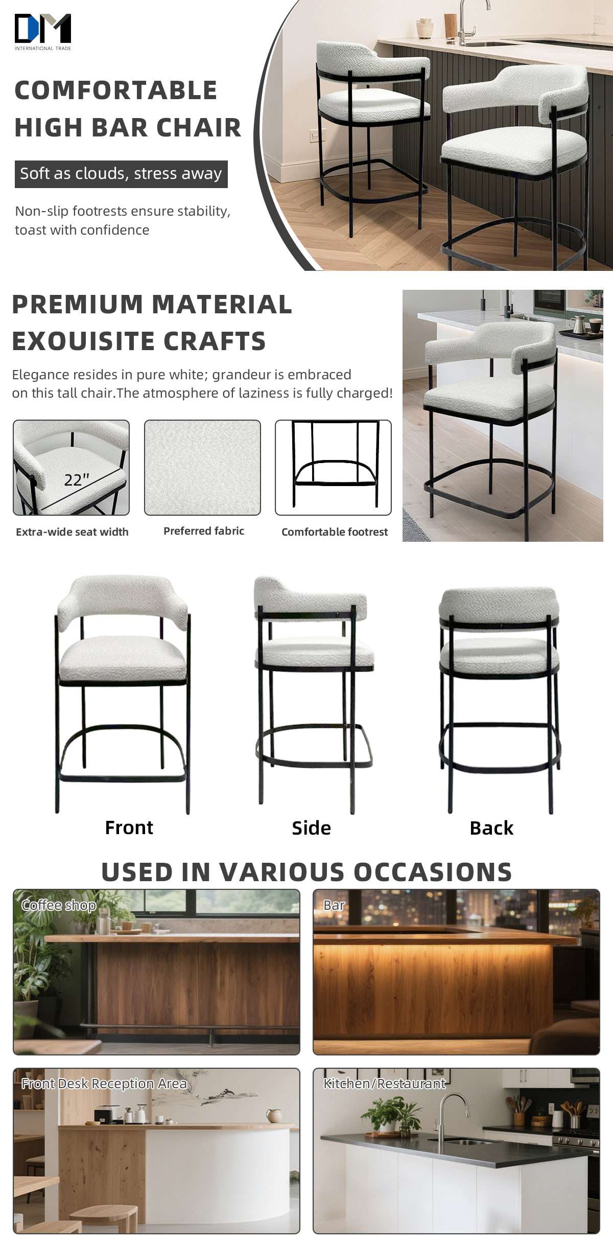 This modern upholstered bar chair with backrest and footrest is designed for kitchen islands, bars, cafés, and hotel reception areas. Featuring a white fabric cushion, ergonomic curved back, and durable metal frame, it offers comfort, stability, and style for long-term use. With extra-wide seating, anti-slip feet, and premium craftsmanship, it stands out as a versatile choice for upscale interiors.