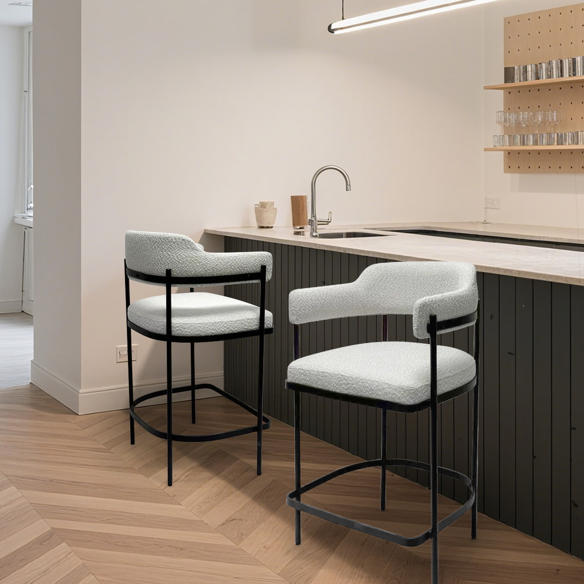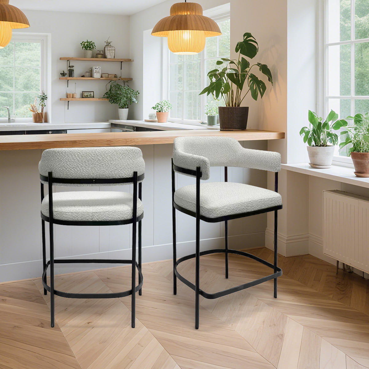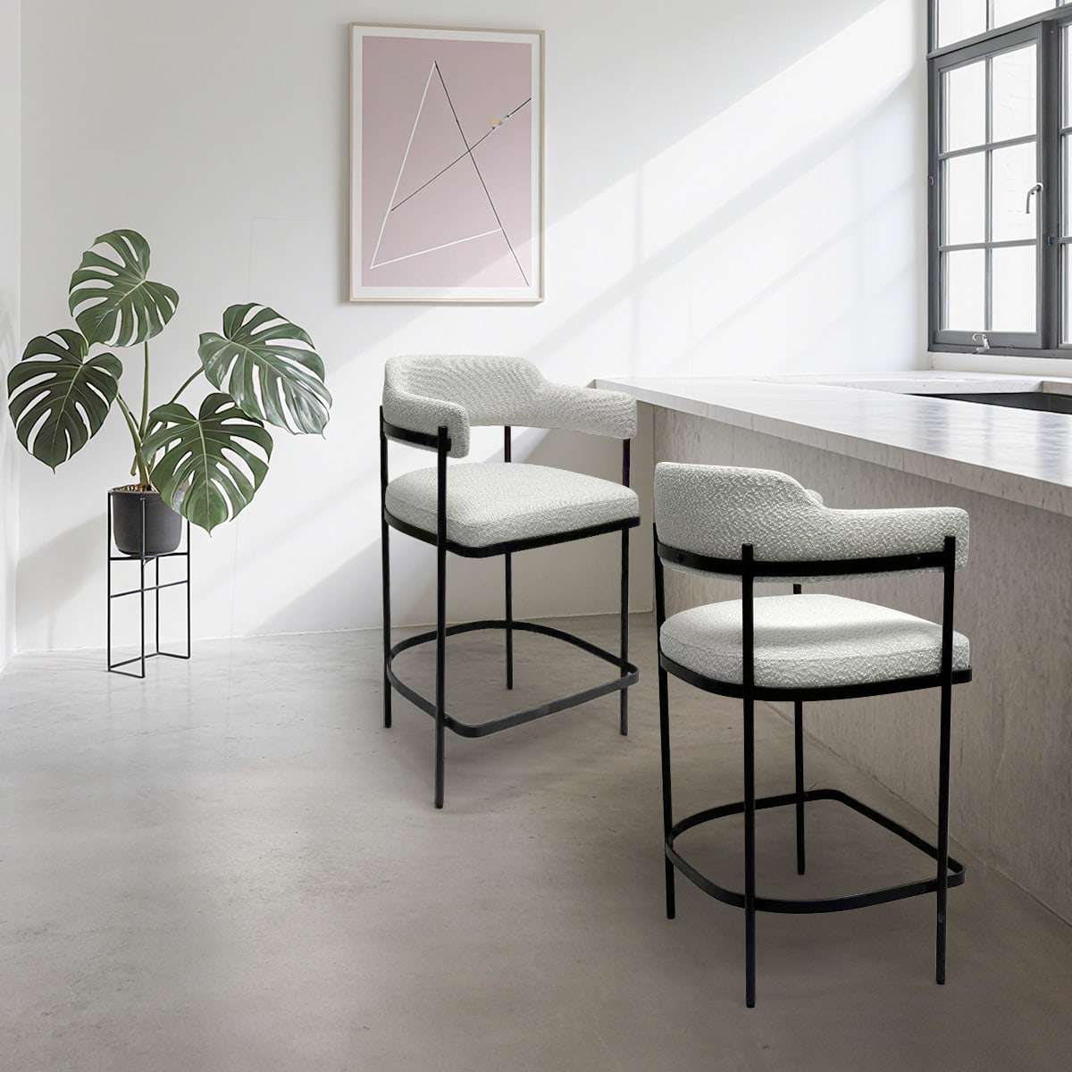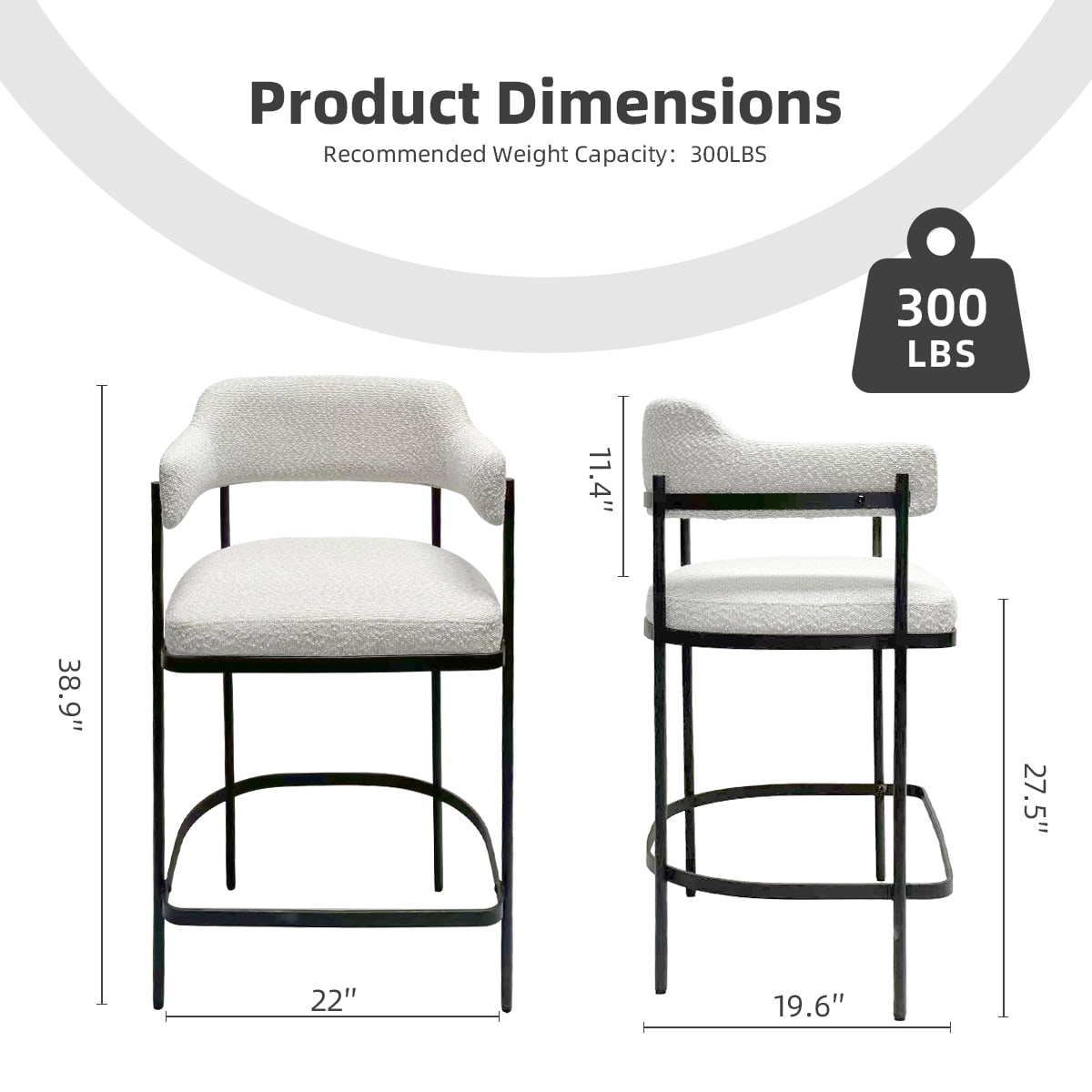 This modern upholstered bar chair with backrest and footrest is designed for kitchen islands, bars, cafés, and hotel reception areas. Featuring a white fabric cushion, ergonomic curved back, and durable metal frame, it offers comfort, stability, and style for long-term use. With extra-wide seating, anti-slip feet, and premium craftsmanship, it stands out as a versatile choice for upscale interiors.