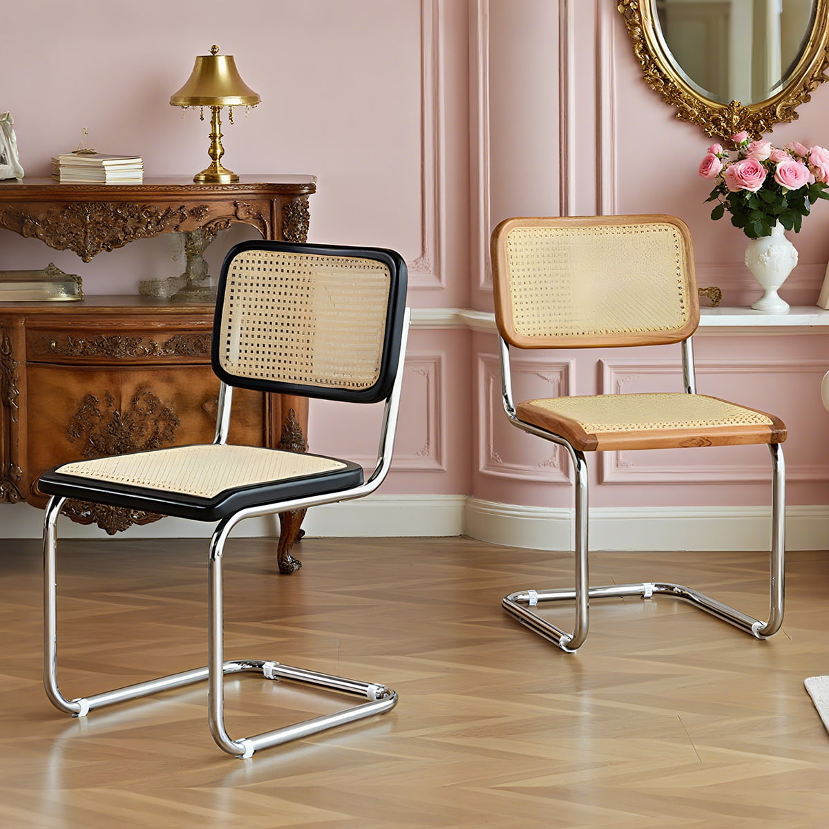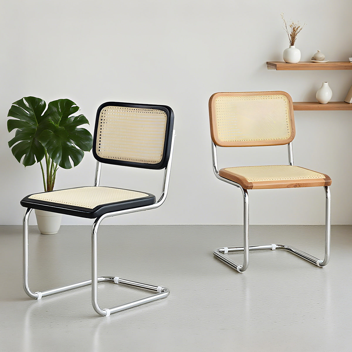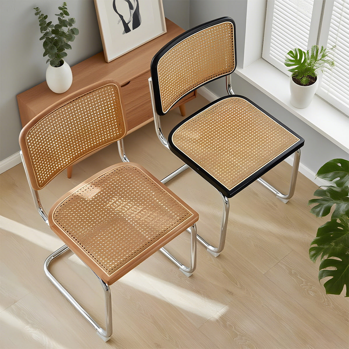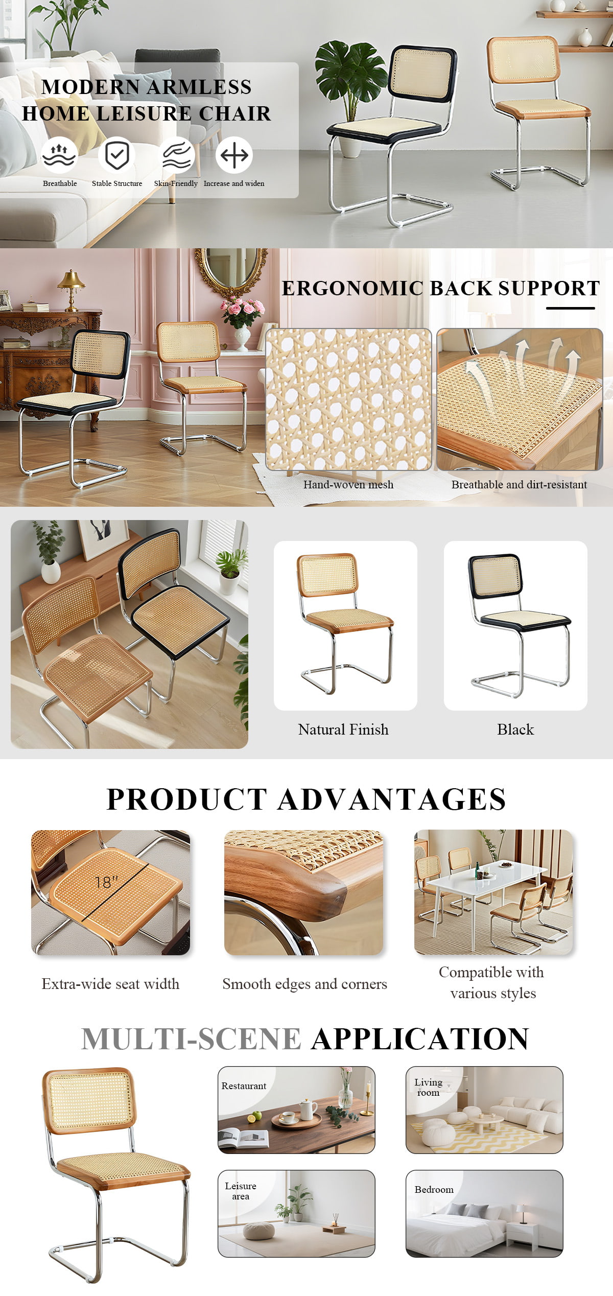 READ MOREBring natural elegance into your dining space with the Beige Rattan Side Chair, combining breathable handwoven cane with a sleek armless design. The 18-inch wide seat and ergonomic backrest provide comfort and support, while the chrome legs and black wood frame ensure durability and modern appeal. Perfect for tight spaces, this chair easily slides under dining tables, making it a versatile seating solution for dining rooms, kitchens, cafés, or lounges. Its neutral beige tone and mid-century modern aesthetic complement a wide range of interior styles, from minimalist to coastal.
