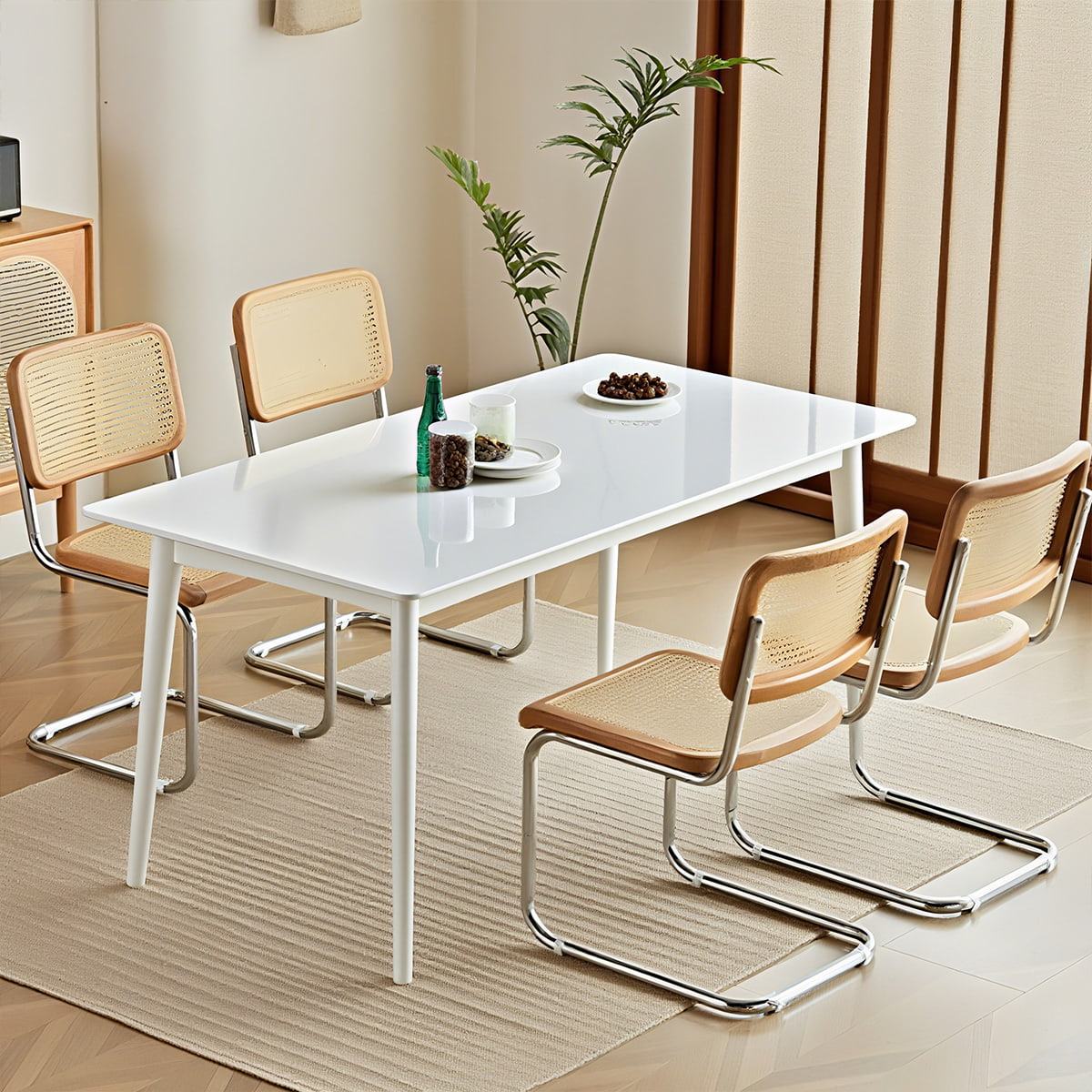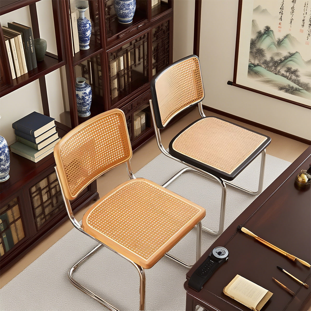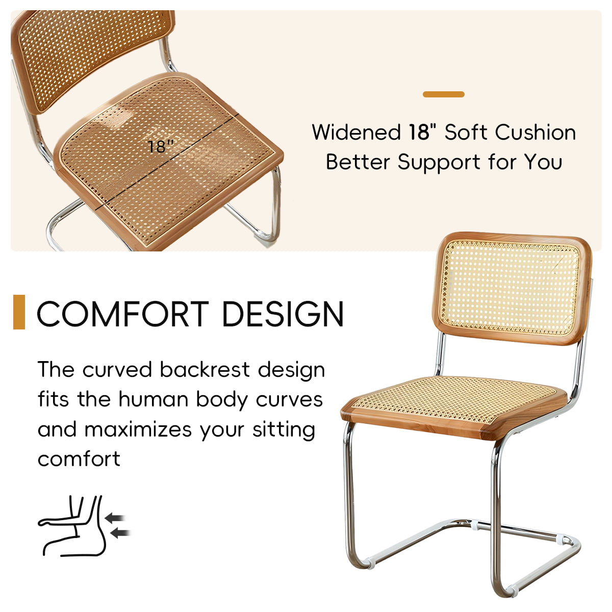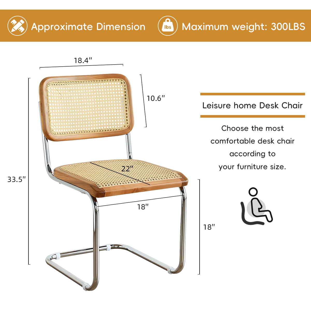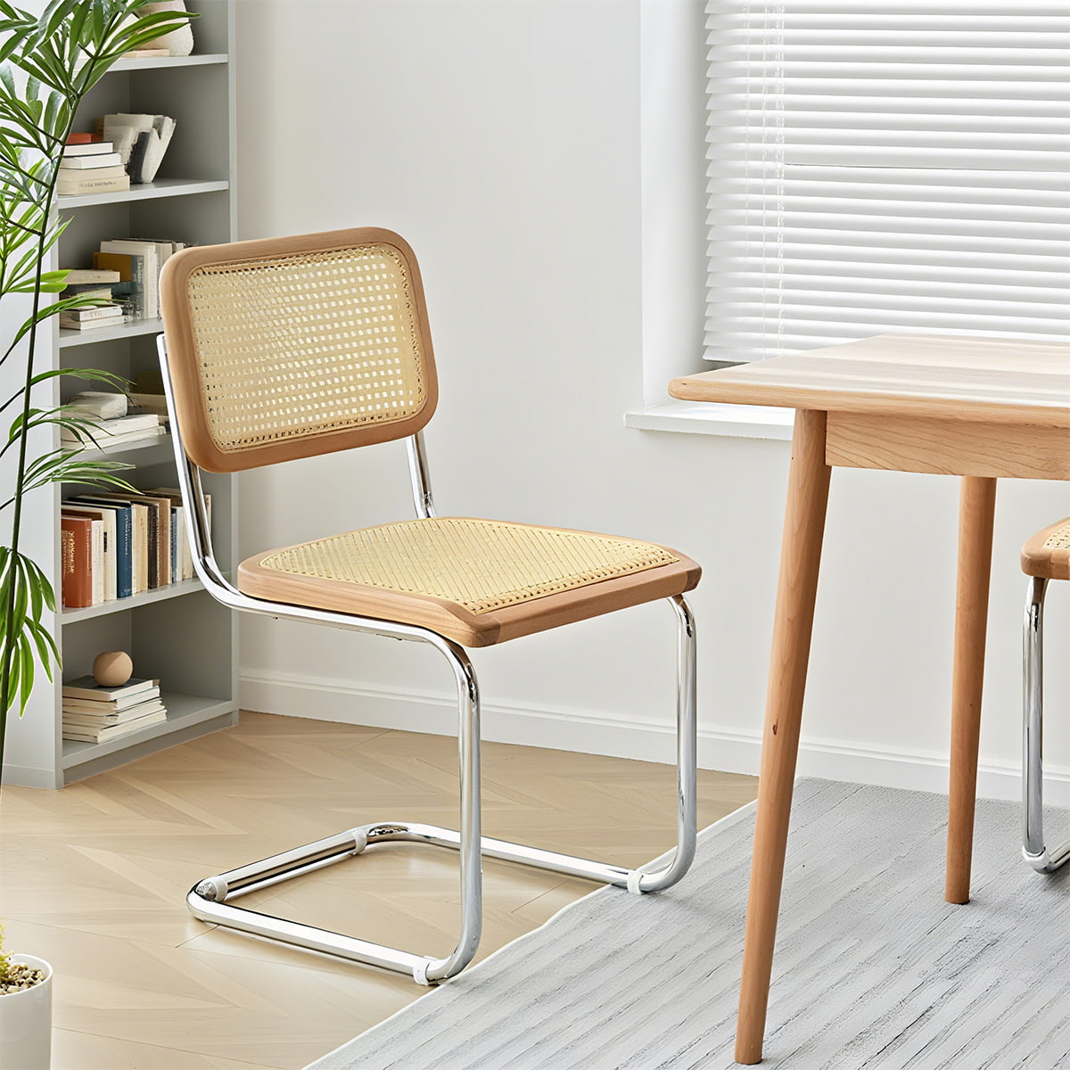 READ MOREBring natural elegance into your dining space with the Beige Rattan Side Chair, combining breathable handwoven cane with a sleek armless design. The 18-inch wide seat and ergonomic backrest provide comfort and support, while the chrome legs and black wood frame ensure durability and modern appeal. Perfect for tight spaces, this chair easily slides under dining tables, making it a versatile seating solution for dining rooms, kitchens, cafés, or lounges. Its neutral beige tone and mid-century modern aesthetic complement a wide range of interior styles, from minimalist to coastal.