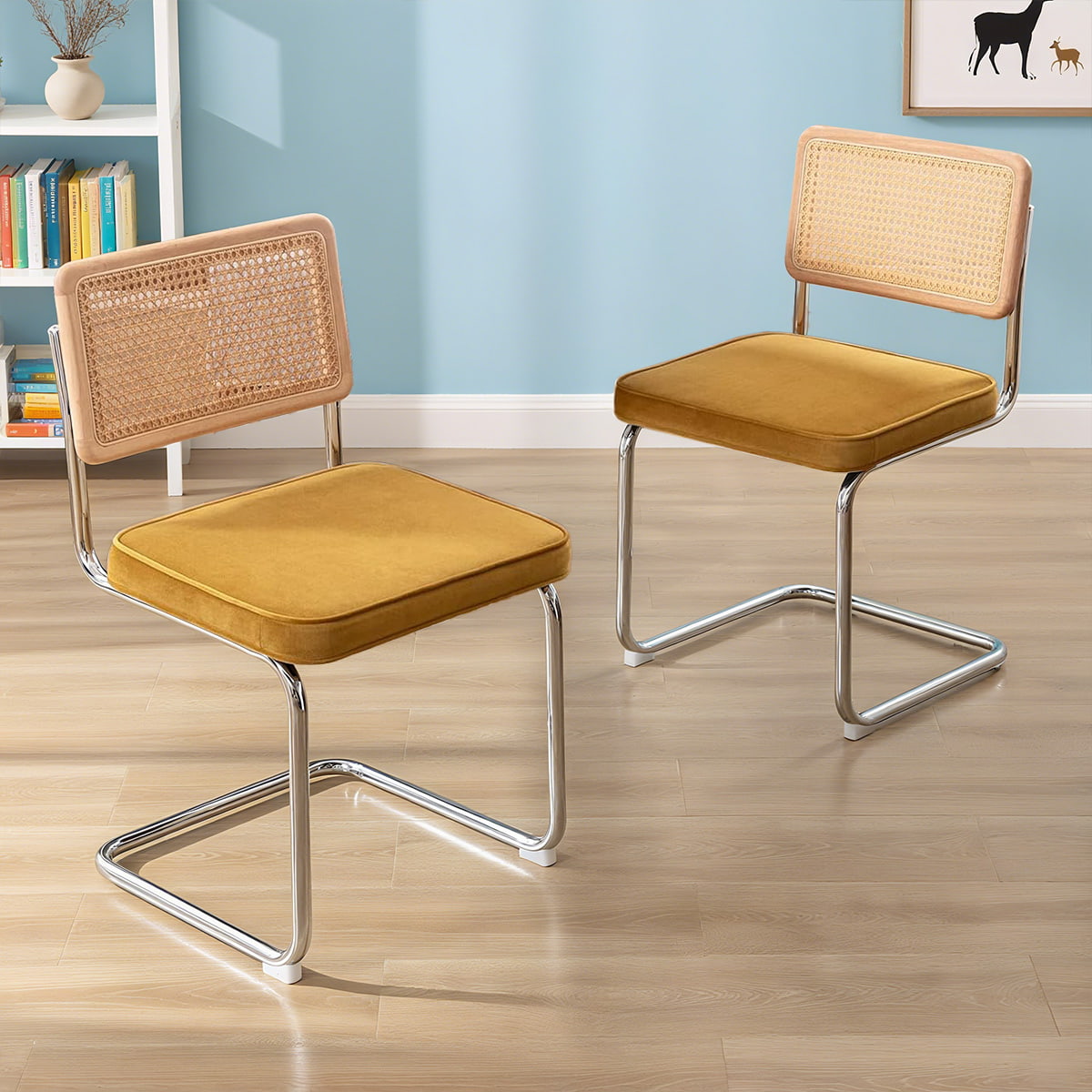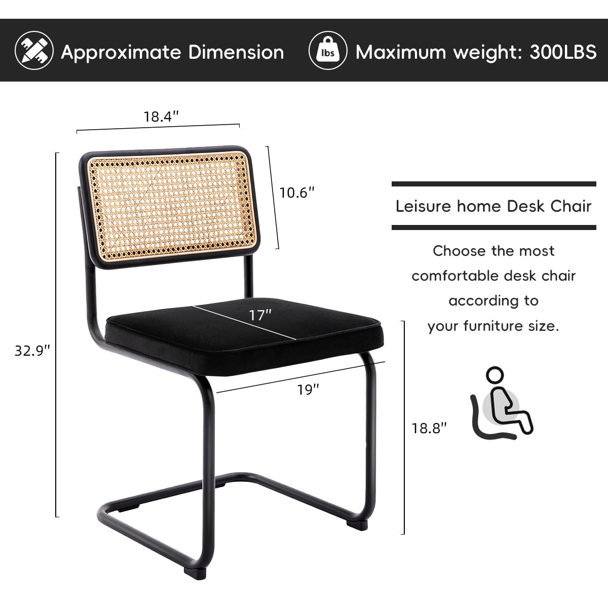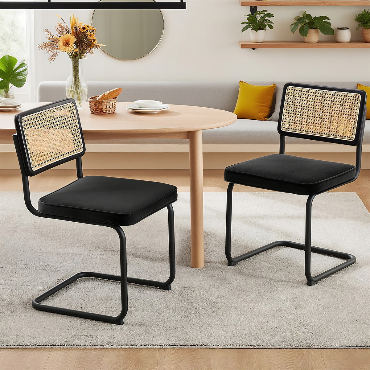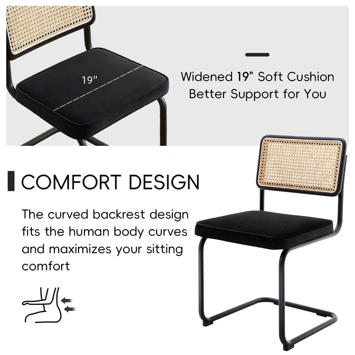 Black Velvet Dining Chair with Handwoven Rattan Cane Back, Mid-Century Modern Side Chair with Chrome Cantilever Frame for Dining Room & Kitchen