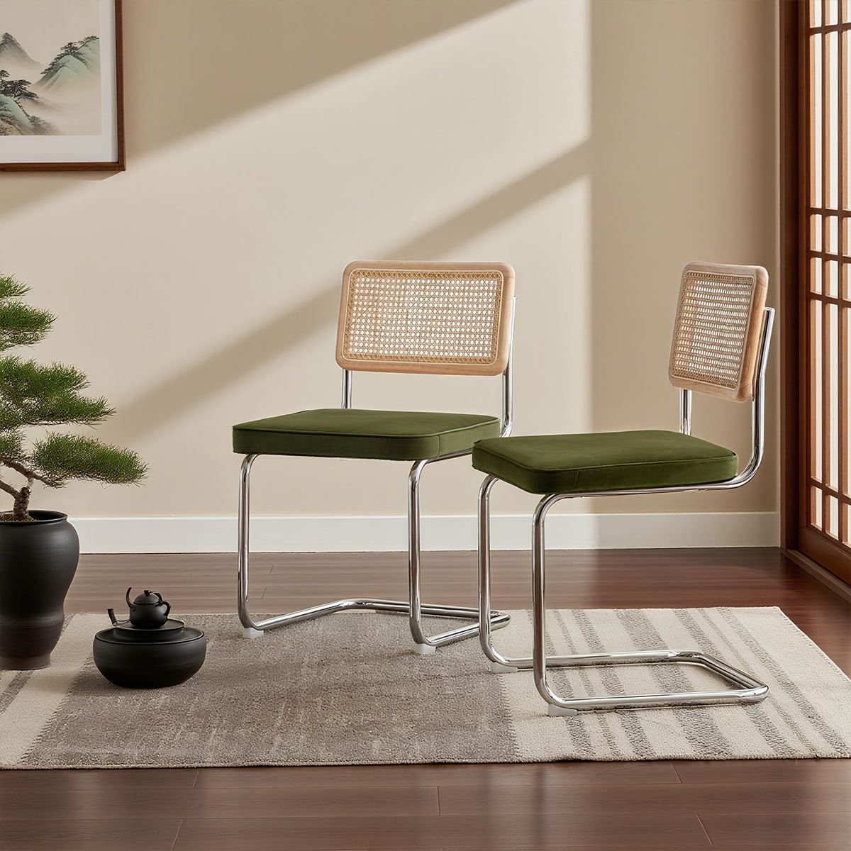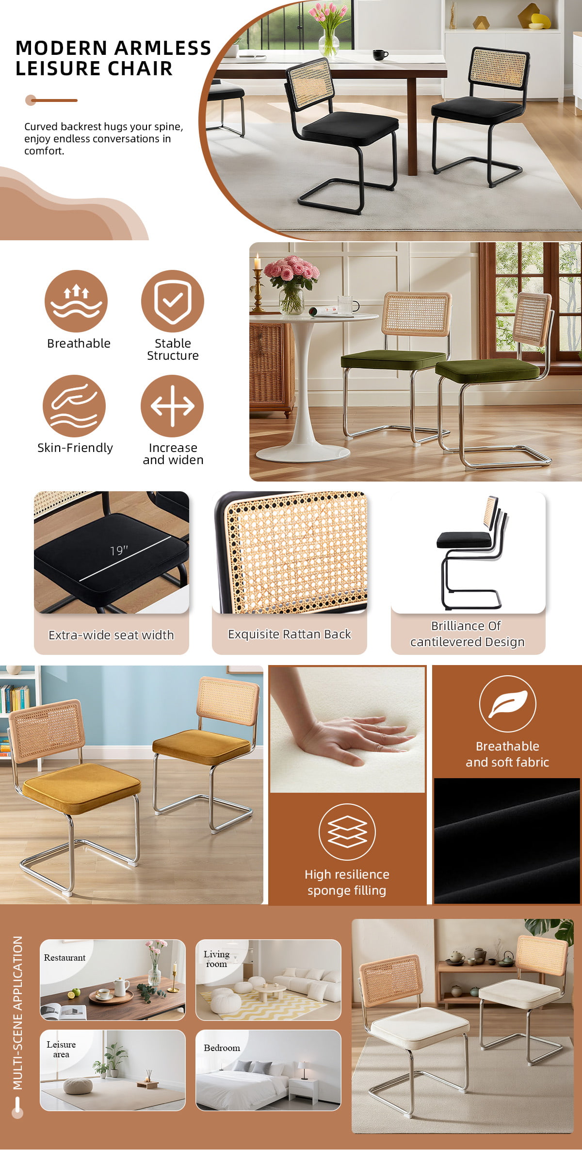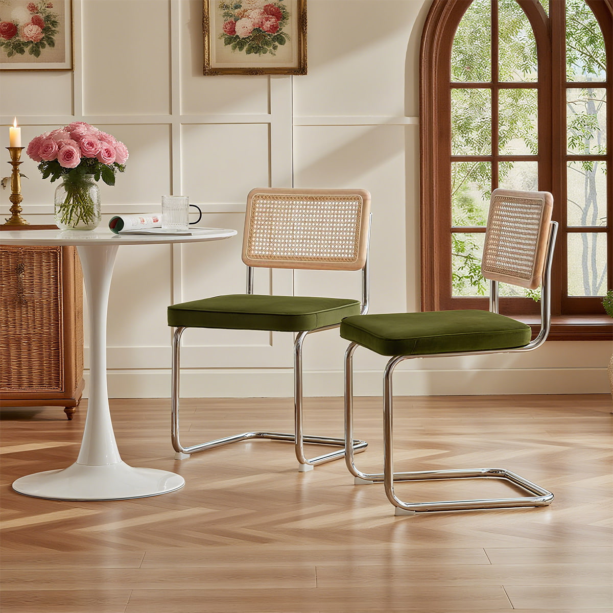READ MOREElevate your dining space with this Black Velvet Dining Chair with Handwoven Cane Back. Inspired by mid-century modern design, it blends natural craftsmanship and industrial elegance. The breathable rattan cane backrest keeps you cool, while the soft velvet seat with high-density sponge offers superior comfort. The sleek cantilever chrome frame adds a touch of sophistication, providing both stability and flexibility. Perfect for dining rooms, kitchens, restaurants, and banquets, this versatile chair is a timeless piece designed for style and everyday use.