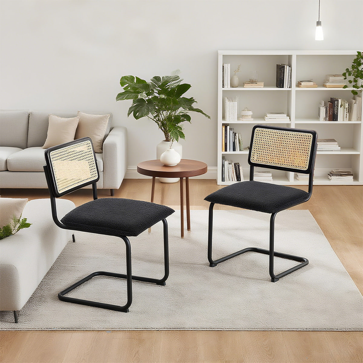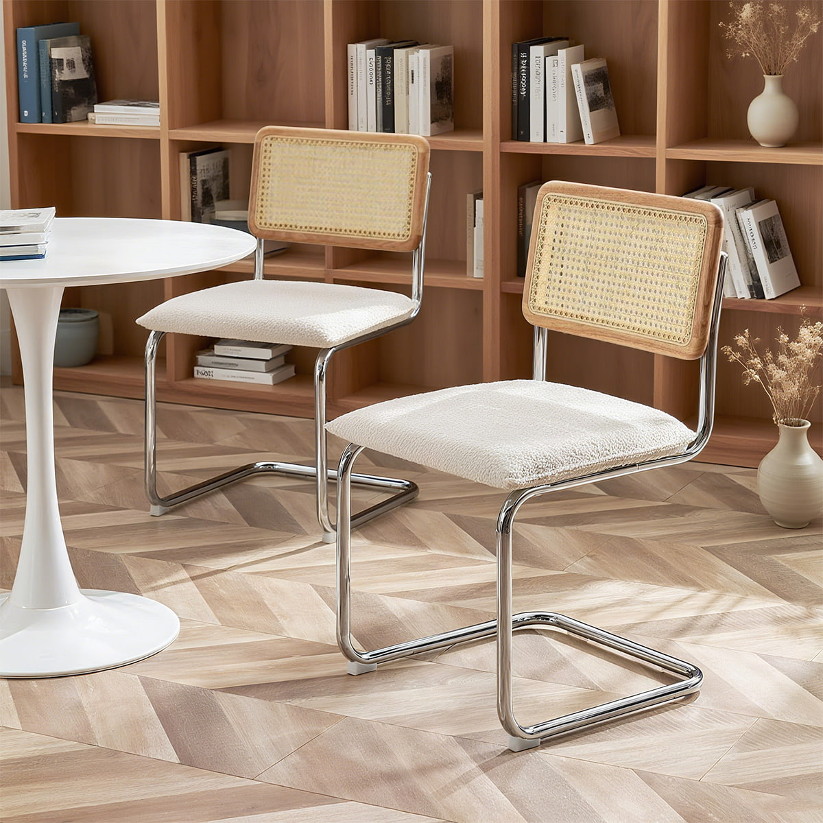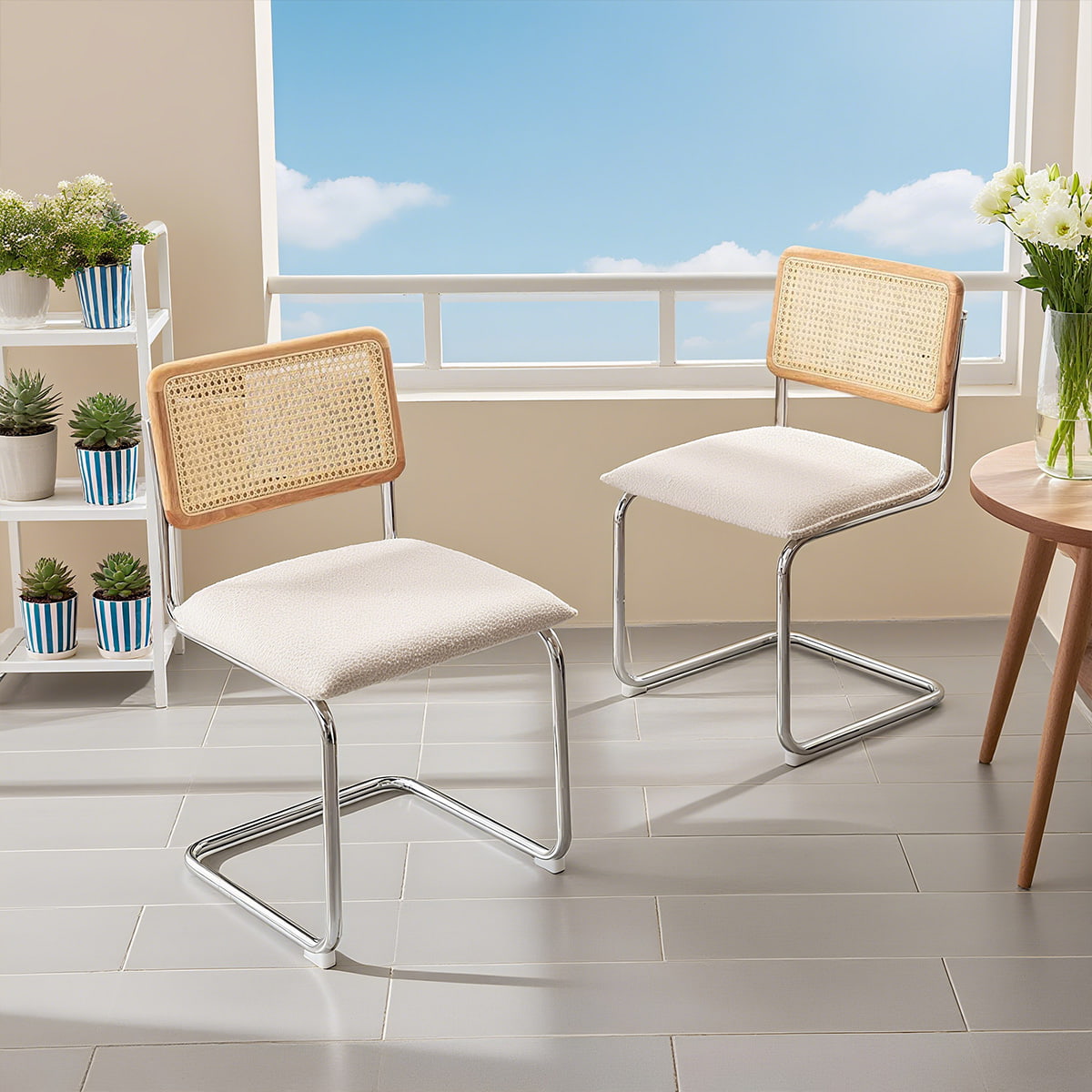 READ MOREElevate your dining space with this Mid-Century Modern Cantilever Dining Chair, featuring a breathable handwoven rattan backrest and a plush boucle-upholstered seat. Designed with a timeless Breuer-inspired silhouette, it combines natural warmth with modern elegance. The chrome-plated tubular steel frame ensures durability and a sleek aesthetic, while the cantilever design provides flexible comfort. Non-slip pads protect your floors, and the neutral white finish blends seamlessly with various interior styles. Ideal for dining rooms, kitchens, restaurants, and cafés, this chair offers a refined seating solution that balances style, comfort, and practicality.