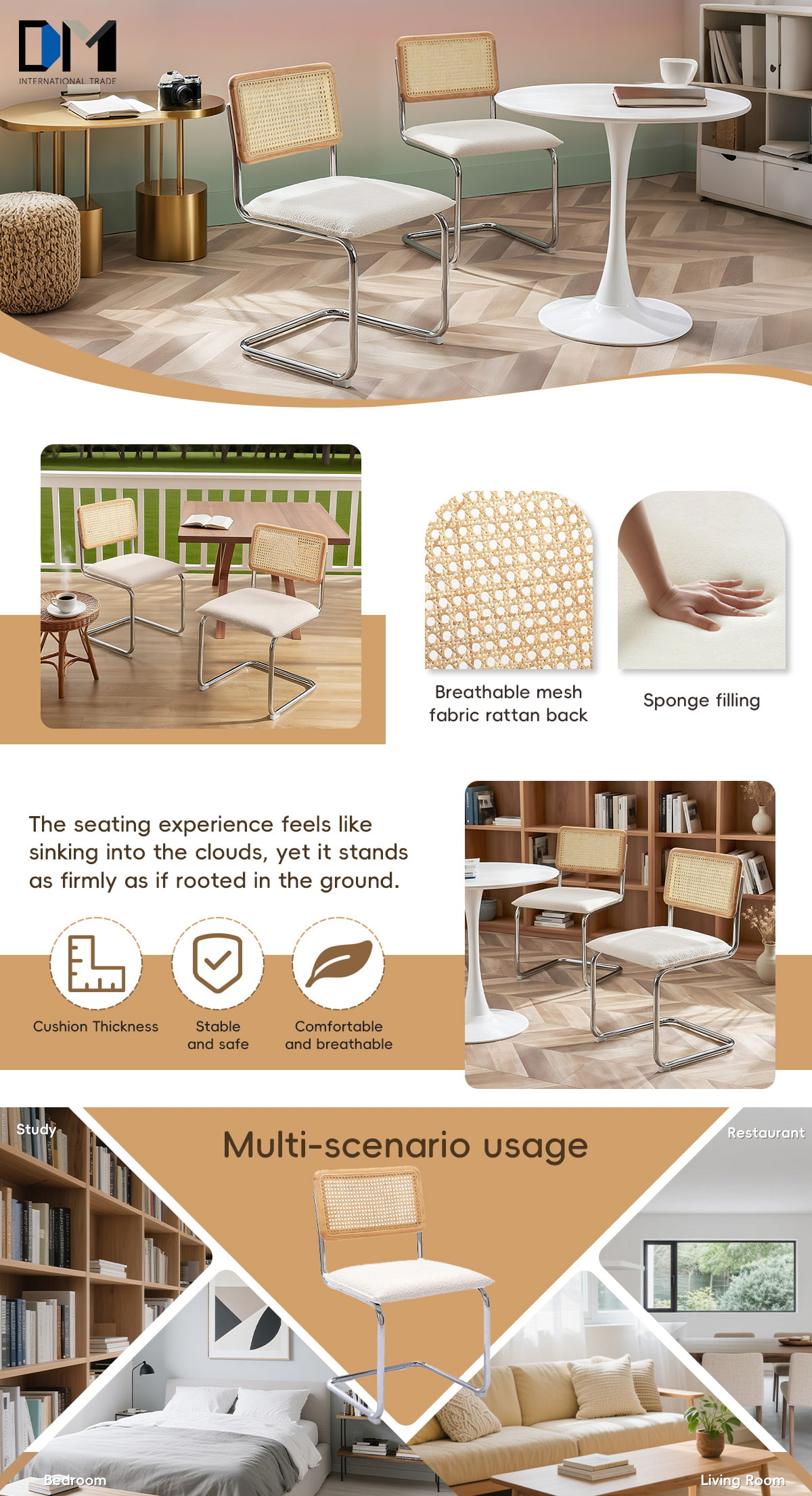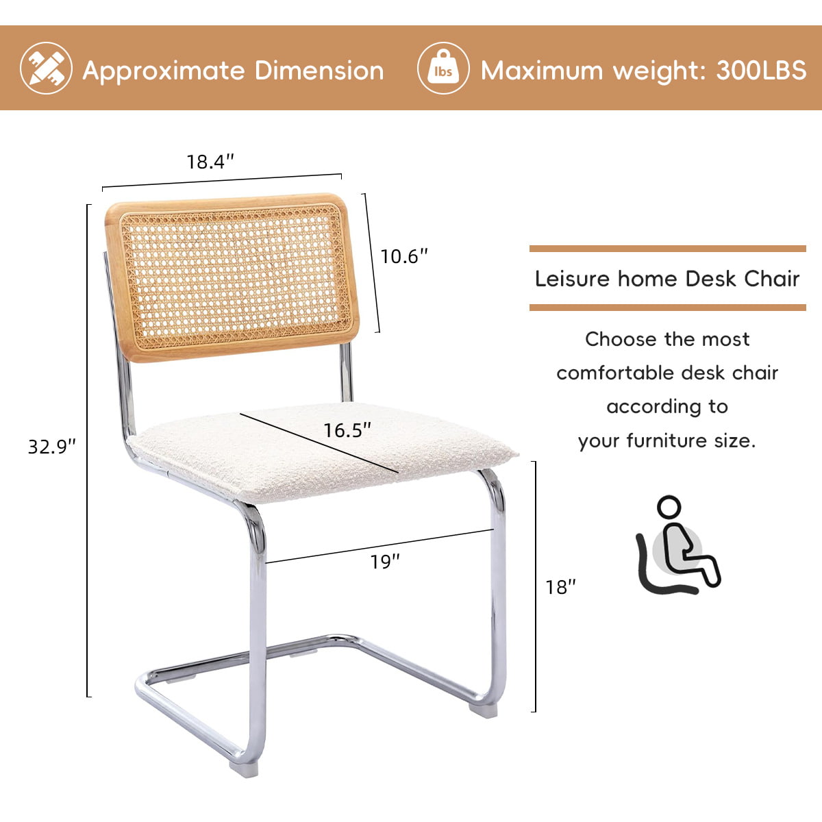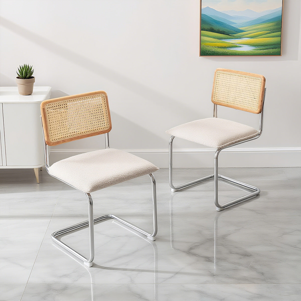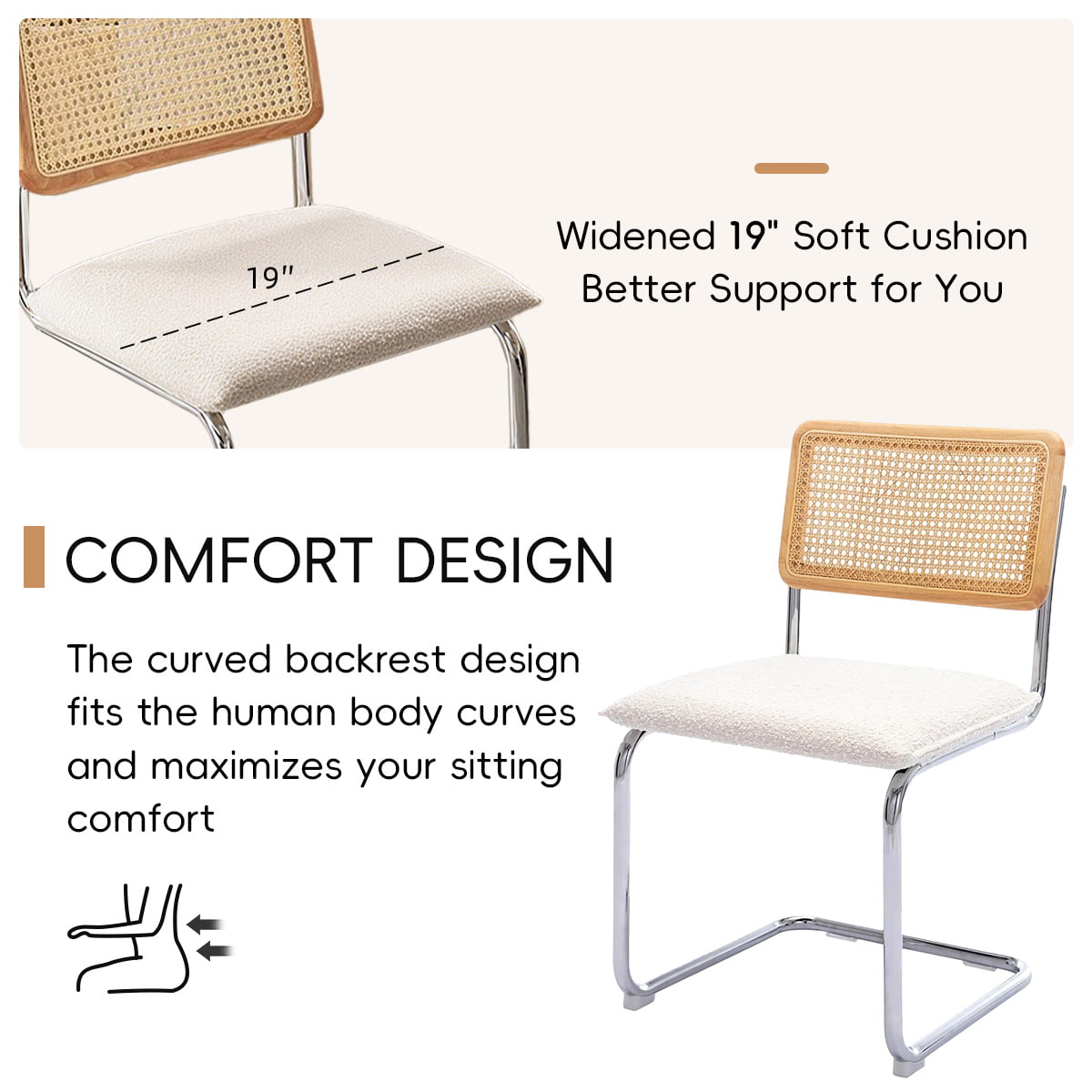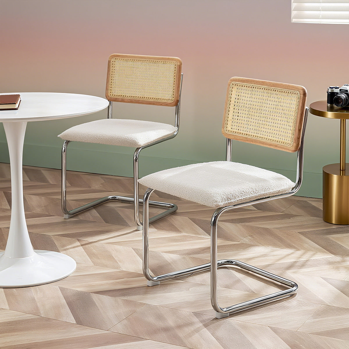 This white boucle dining chair with rattan back is the perfect combination of mid-century modern style and everyday comfort. Featuring a handwoven cane backrest, breathable materials, and a chrome cantilever frame, it brings elegance to kitchens, dining rooms, restaurants, and cafés.