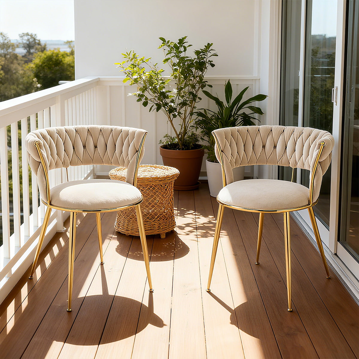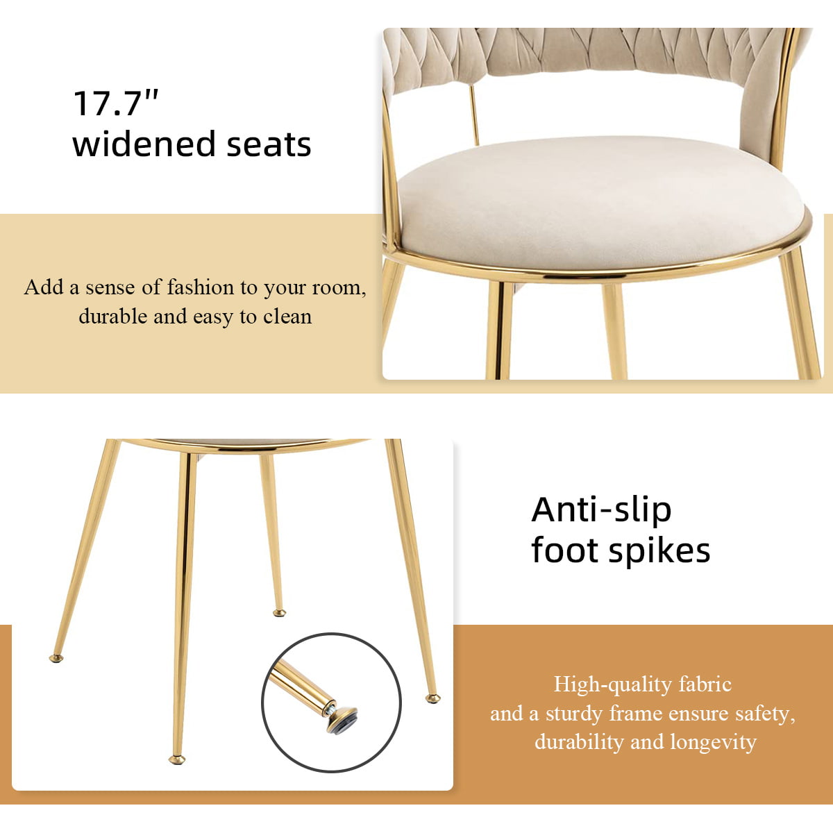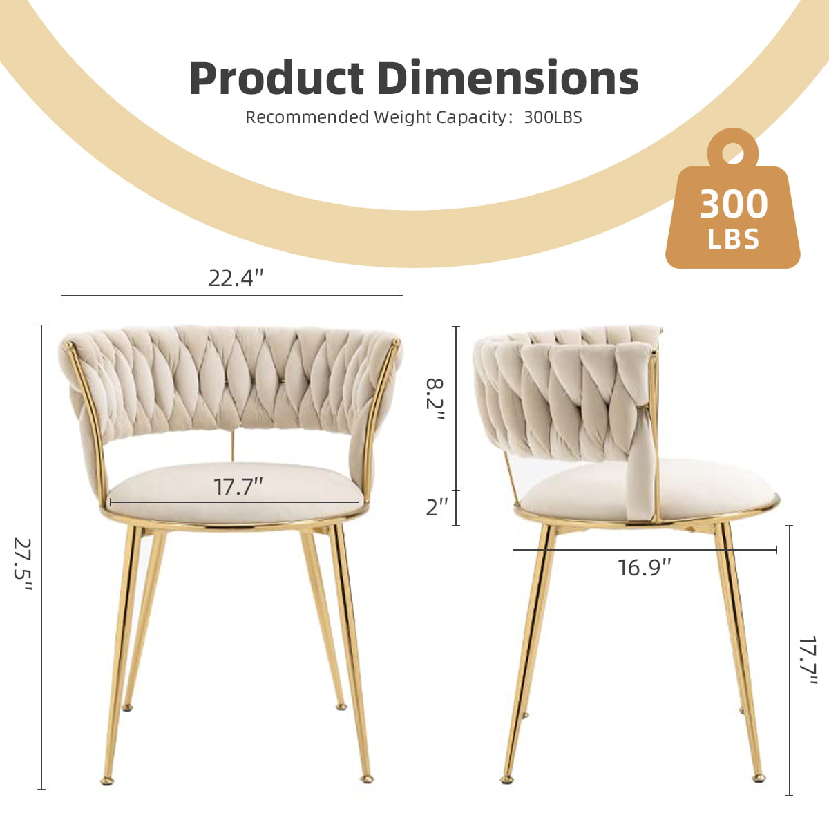Modern Ivory Velvet Dining Chair with Woven Backrest & Gold Metal Legs – Elegant Upholstered Accent Chair for Dining Room, Kitchen, or Living Space