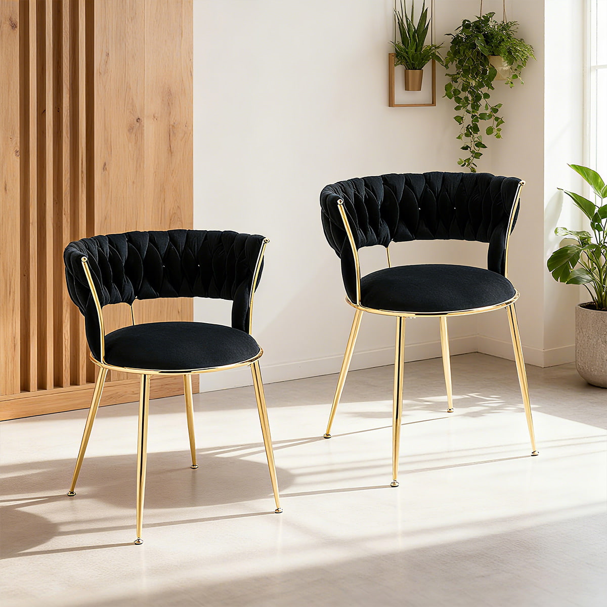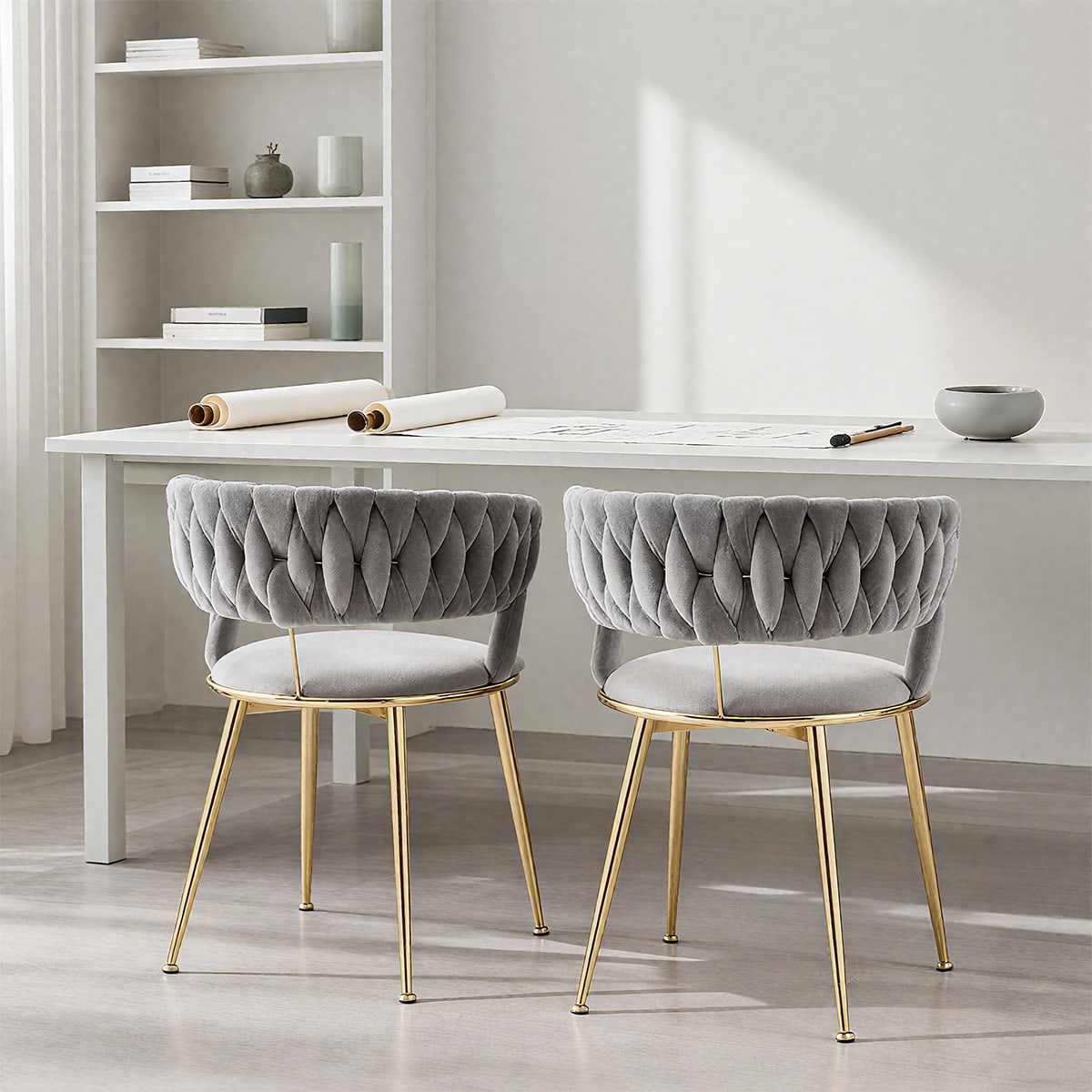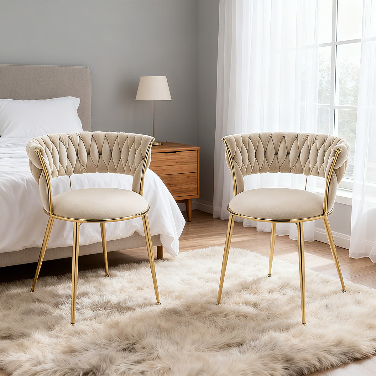Modern Ivory Velvet Dining Chair with Woven Backrest & Gold Metal Legs – Elegant Upholstered Accent Chair for Dining Room, Kitchen, or Living Space
