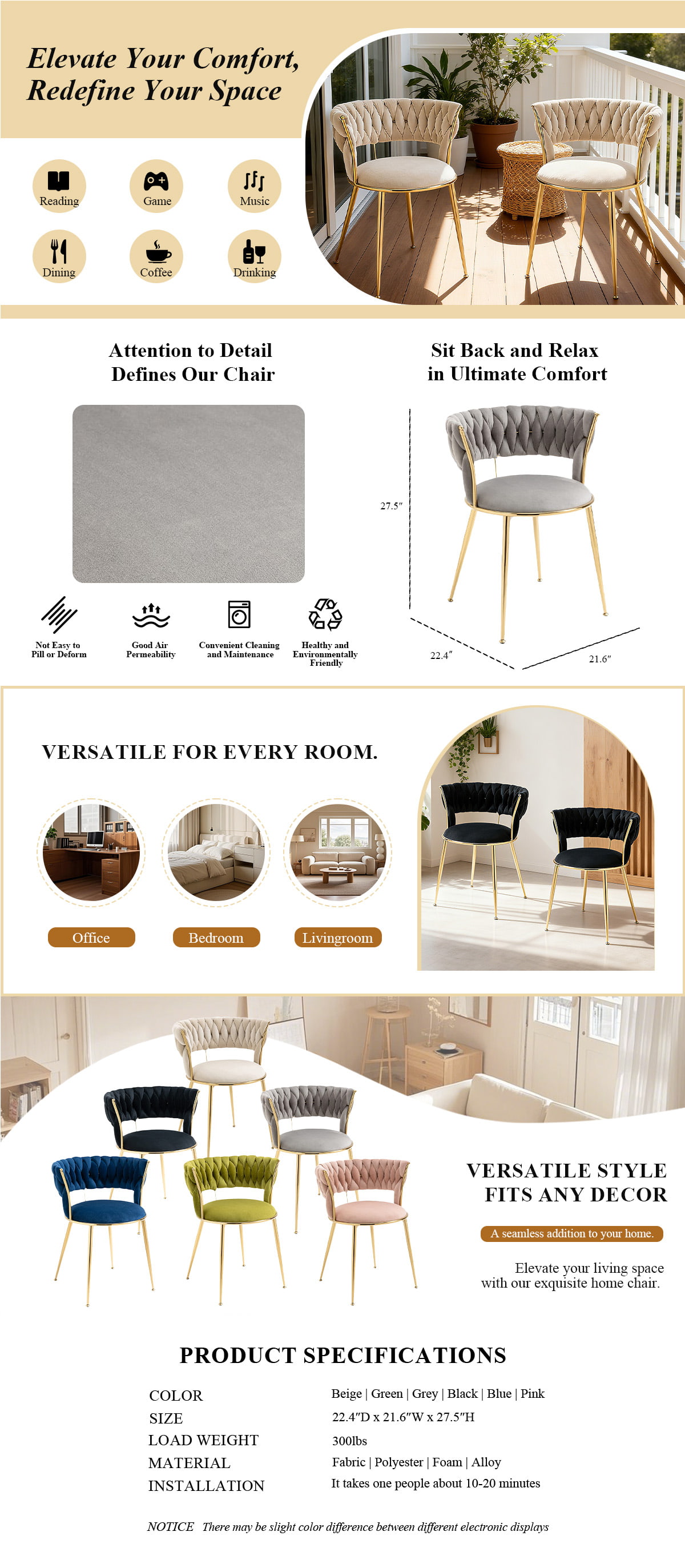 READ MORERefined elegance meets functional comfort in this Modern Ivory Velvet Dining Chair by Anji Duomei Intelligence Furniture Technology Co., Ltd. Featuring a beautifully woven backrest and gold-finished metal legs, this chair elevates your dining or lounge space with a perfect mix of sophistication and durability. The ergonomic design embraces your back while the soft velvet fabric and high-density foam ensure plush comfort. Anti-slip foot caps and a reinforced alloy frame guarantee stability and longevity. Lightweight yet sturdy, it fits seamlessly into modern, mid-century, or art deco interiors — a stylish statement piece that adds charm to any room.
