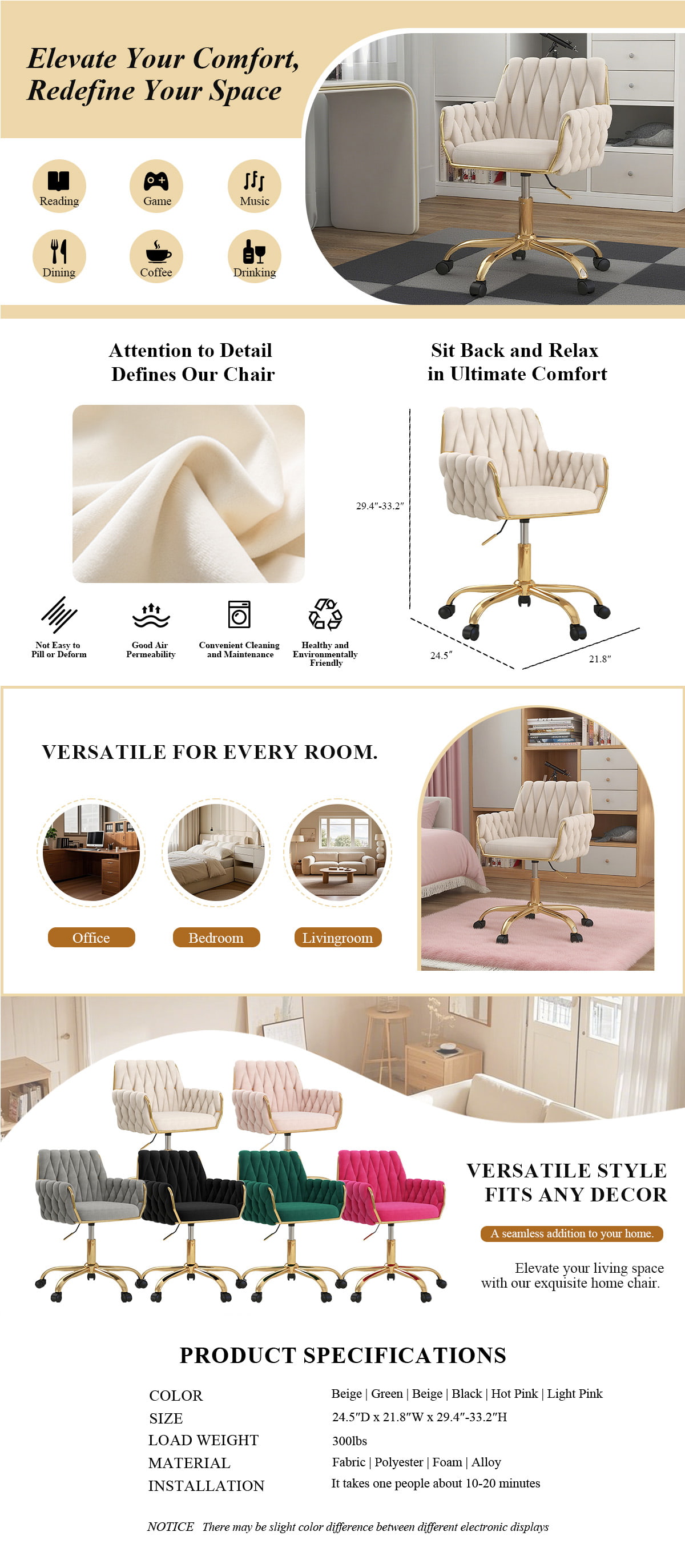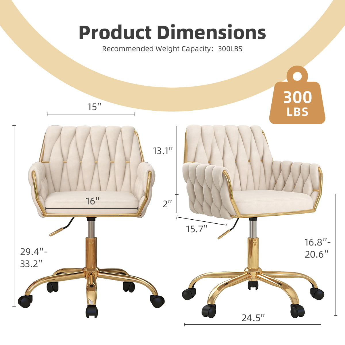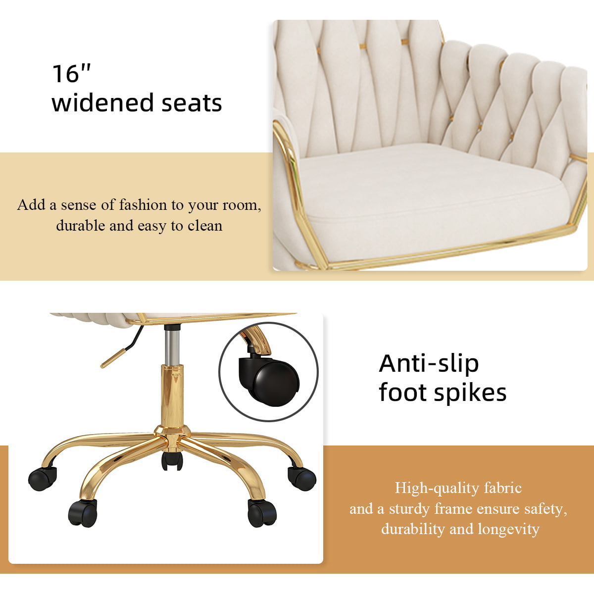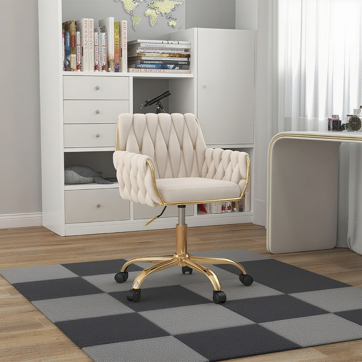 Beige Velvet Home Office Chair – Modern Adjustable Vanity Chair with Golden Base, Hand-Woven Backrest & Armrest, 360° Swivel Rolling Desk Chair