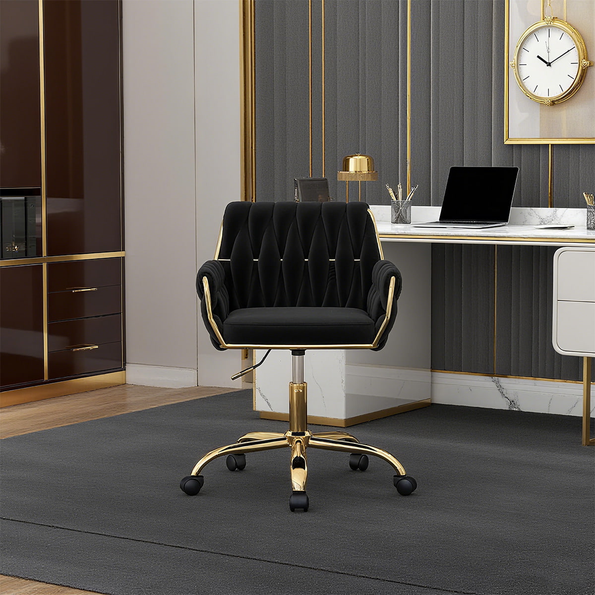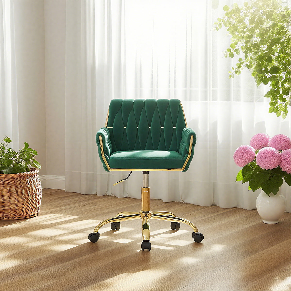 This modern beige velvet office chair with golden base is the ideal vanity chair, home office desk chair, and study room swivel chair. Featuring luxury velvet upholstery, ergonomic woven backrest, padded armrests, and adjustable seat height, it ensures all-day comfort while enhancing your interior décor. The 360° swivel base with smooth casters makes it versatile for work, makeup, reading, or gaming.