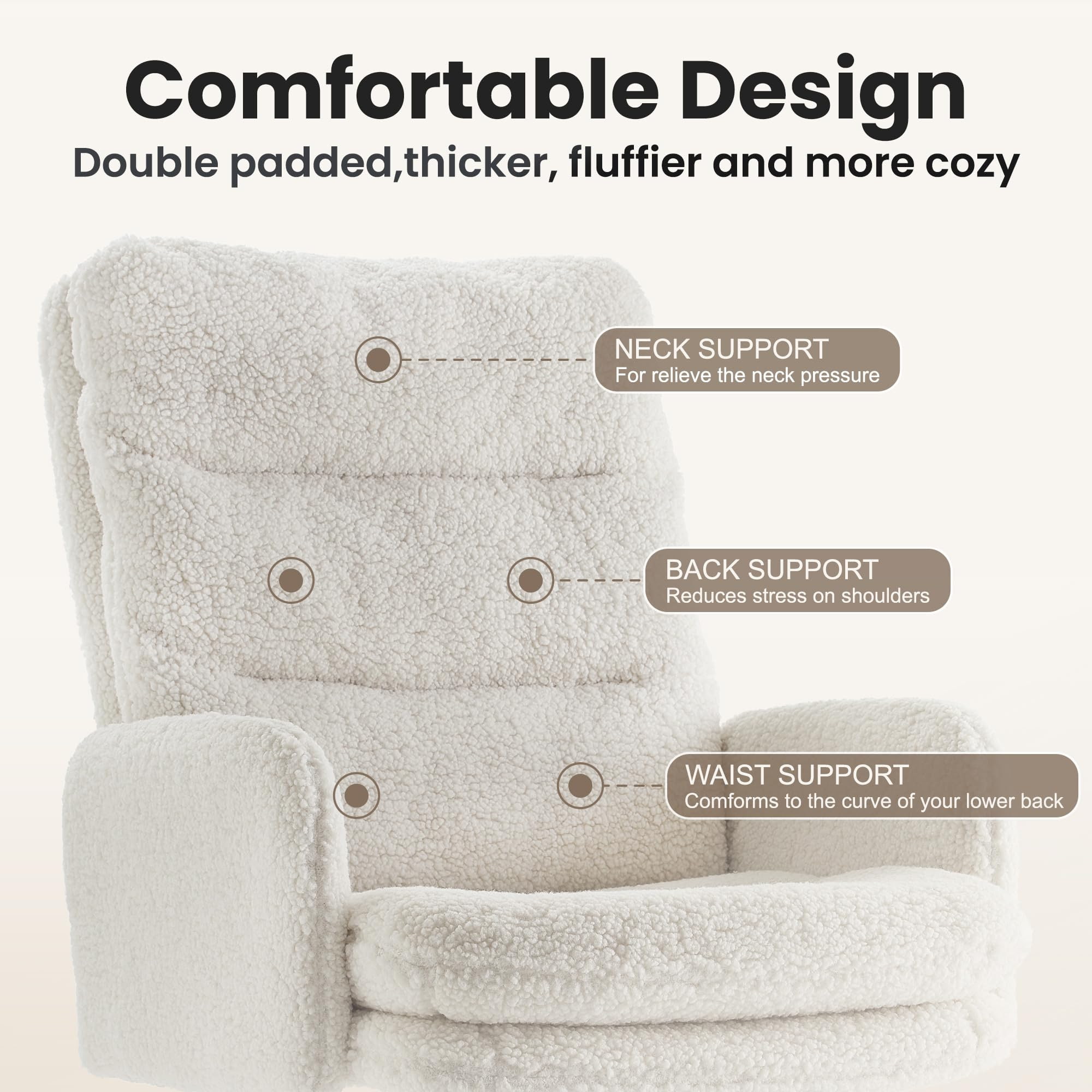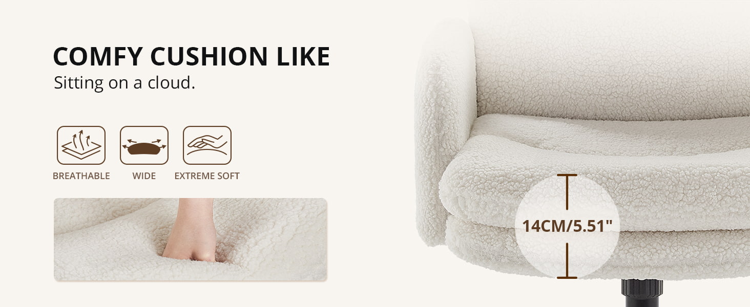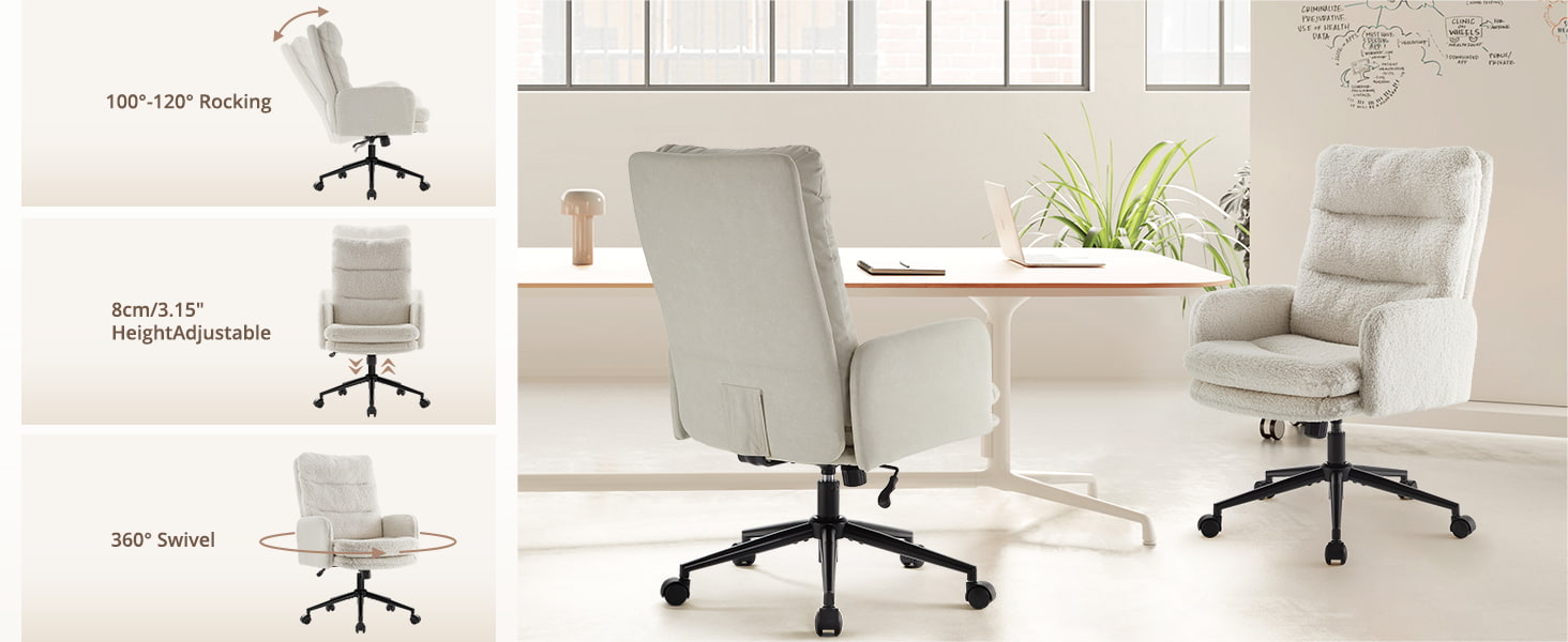 The dual-layer cushion—featuring fluffy figure cotton and high-density sponge—offers a cloud-like sitting experience that stays comfortable even during long working or studying sessions. The chair includes a 100°–120° rocking function, a 3.15" (8 cm) height-adjustable seat, and 360° swivel, giving you full flexibility throughout the day.