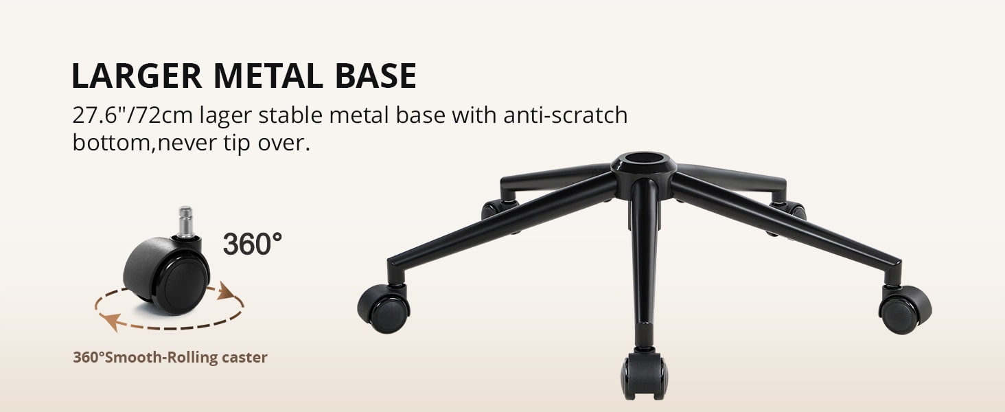 A wide 72 cm (28.35") metal base ensures stability, and the silent nylon casters roll smoothly without scratching your floor. Perfect for home offices, study rooms, bedrooms, and vanity setups, this chair blends comfort, aesthetics, and everyday practicality.