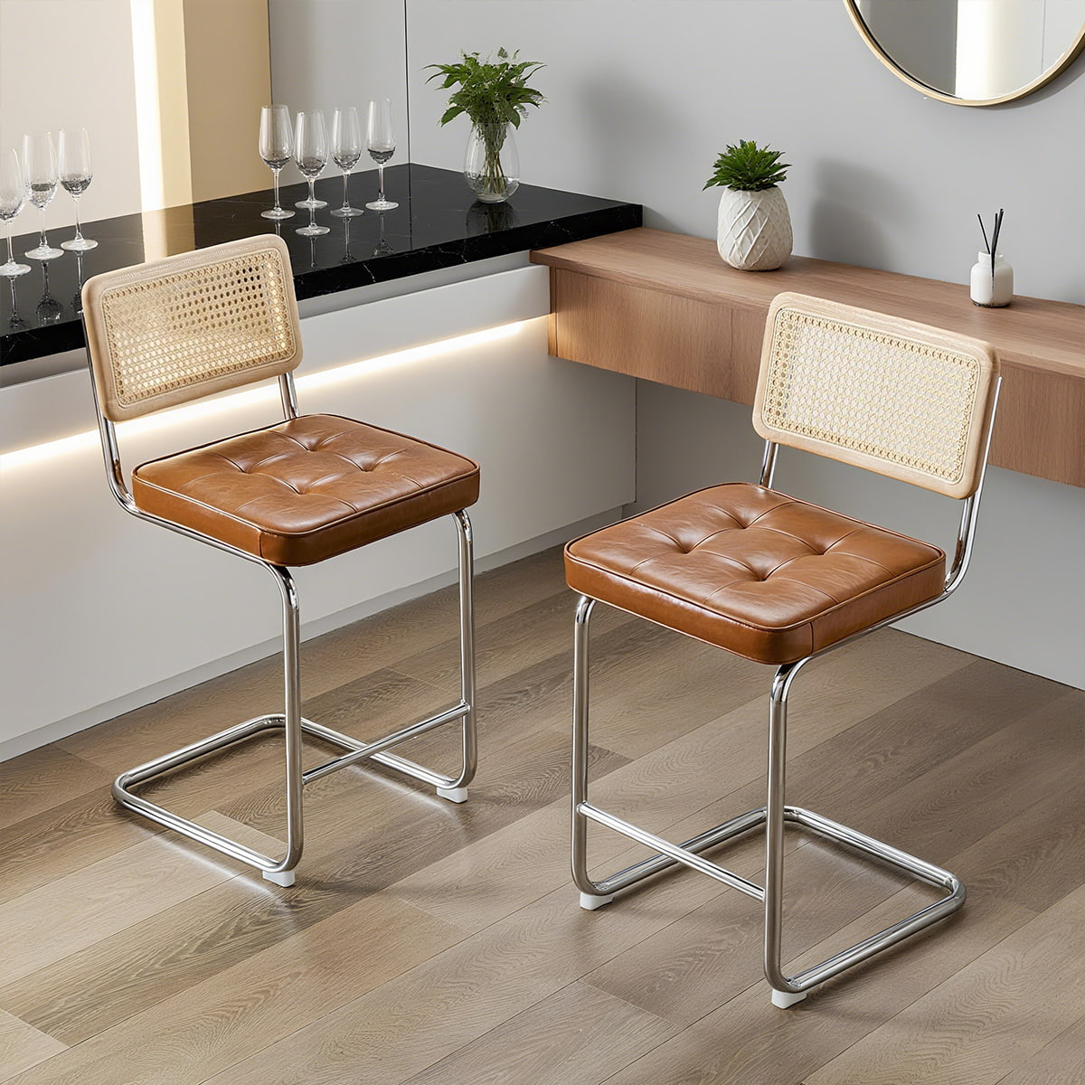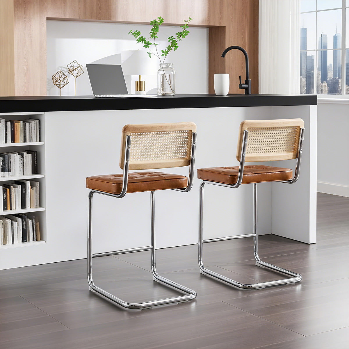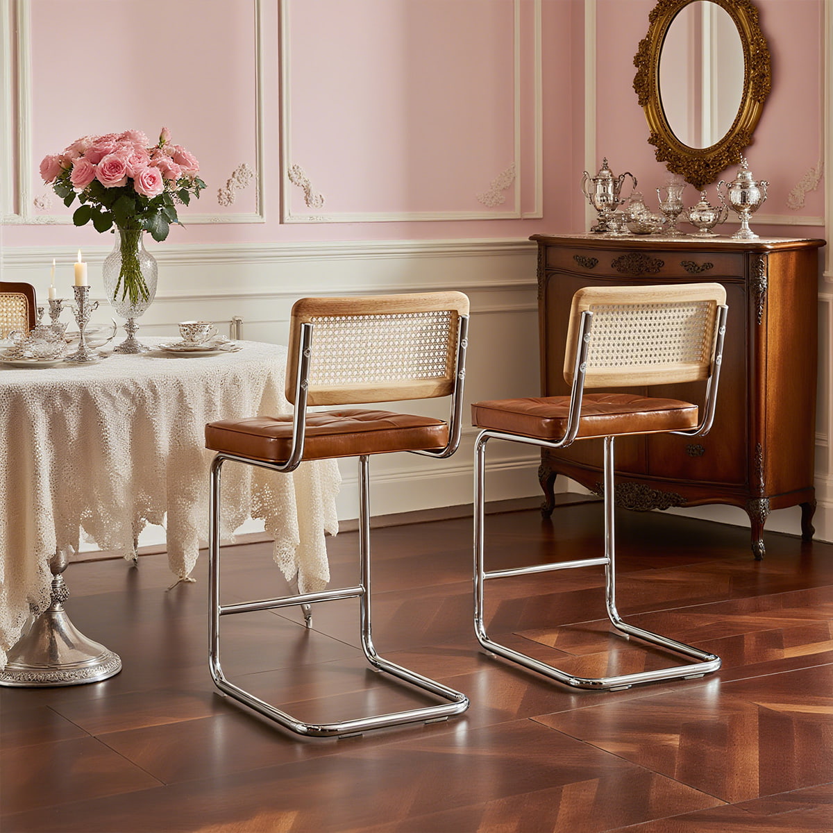 READ MOREThis low-back tufted faux leather counter stool with natural rattan back blends mid-century charm with modern durability. Featuring a handwoven cane backrest, plush high-density foam seat, and a sleek chrome steel sled frame, it delivers both style and comfort. Perfect for kitchen islands, home bars, cafés, and lounges, its breathable rattan back keeps you cool, while the 2.4-inch cushion offers lasting support. The integrated footrest and non-slip pads ensure stability and floor protection. Designed for style-conscious homeowners and commercial spaces alike, this counter stool is a versatile seating solution for any modern interior.