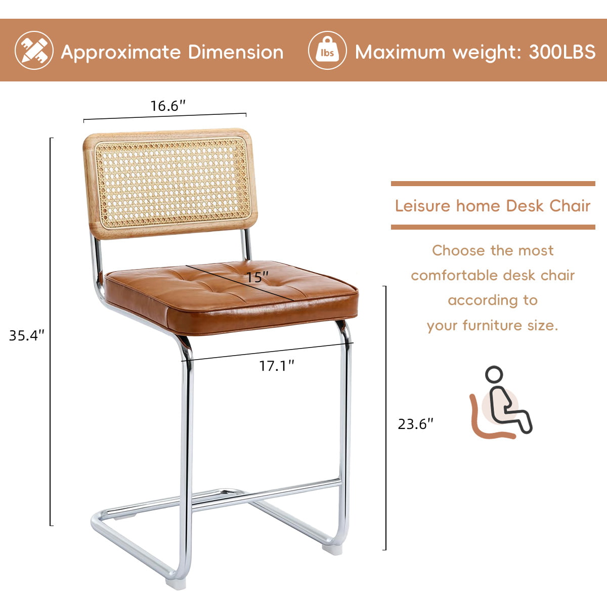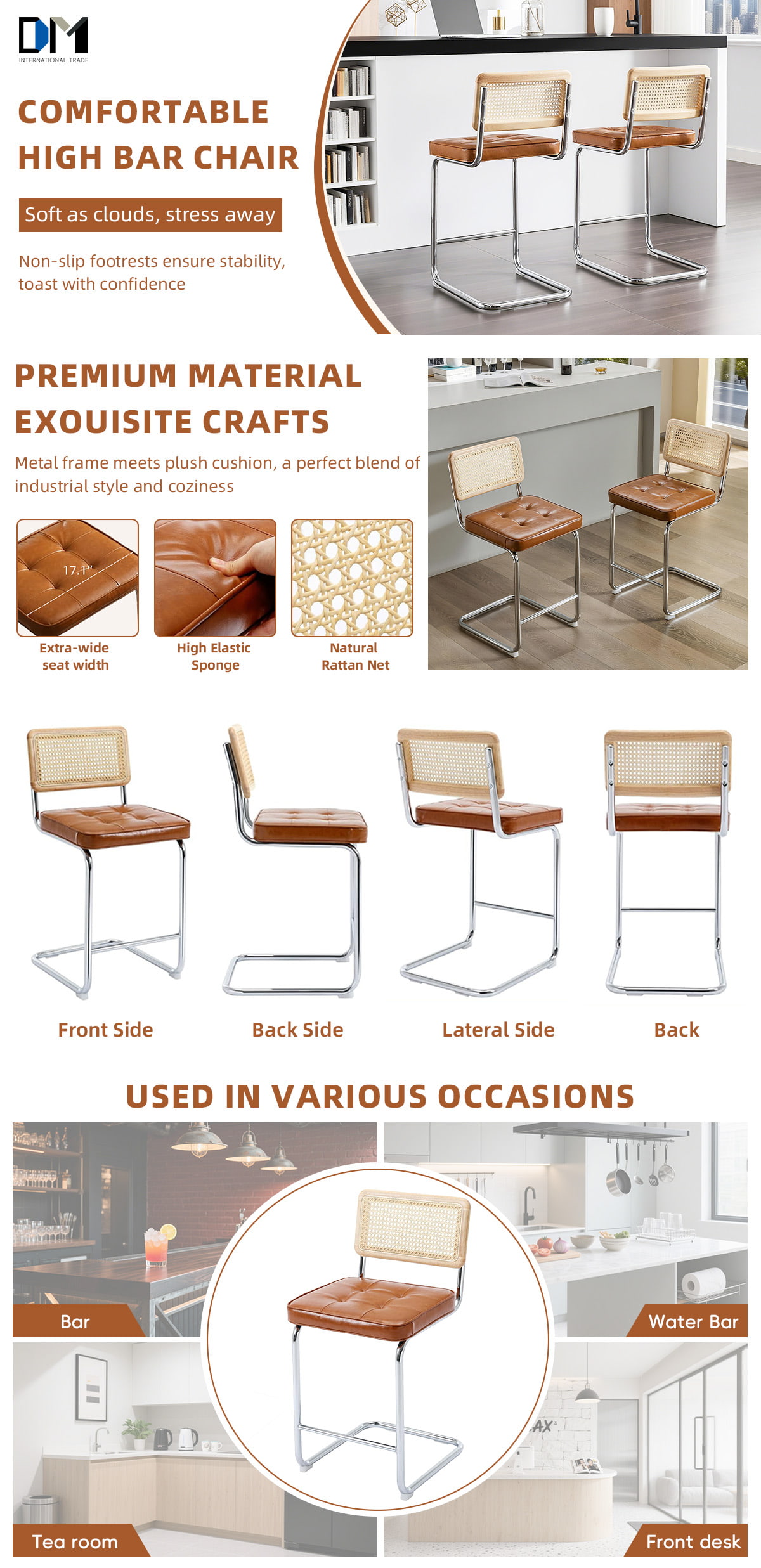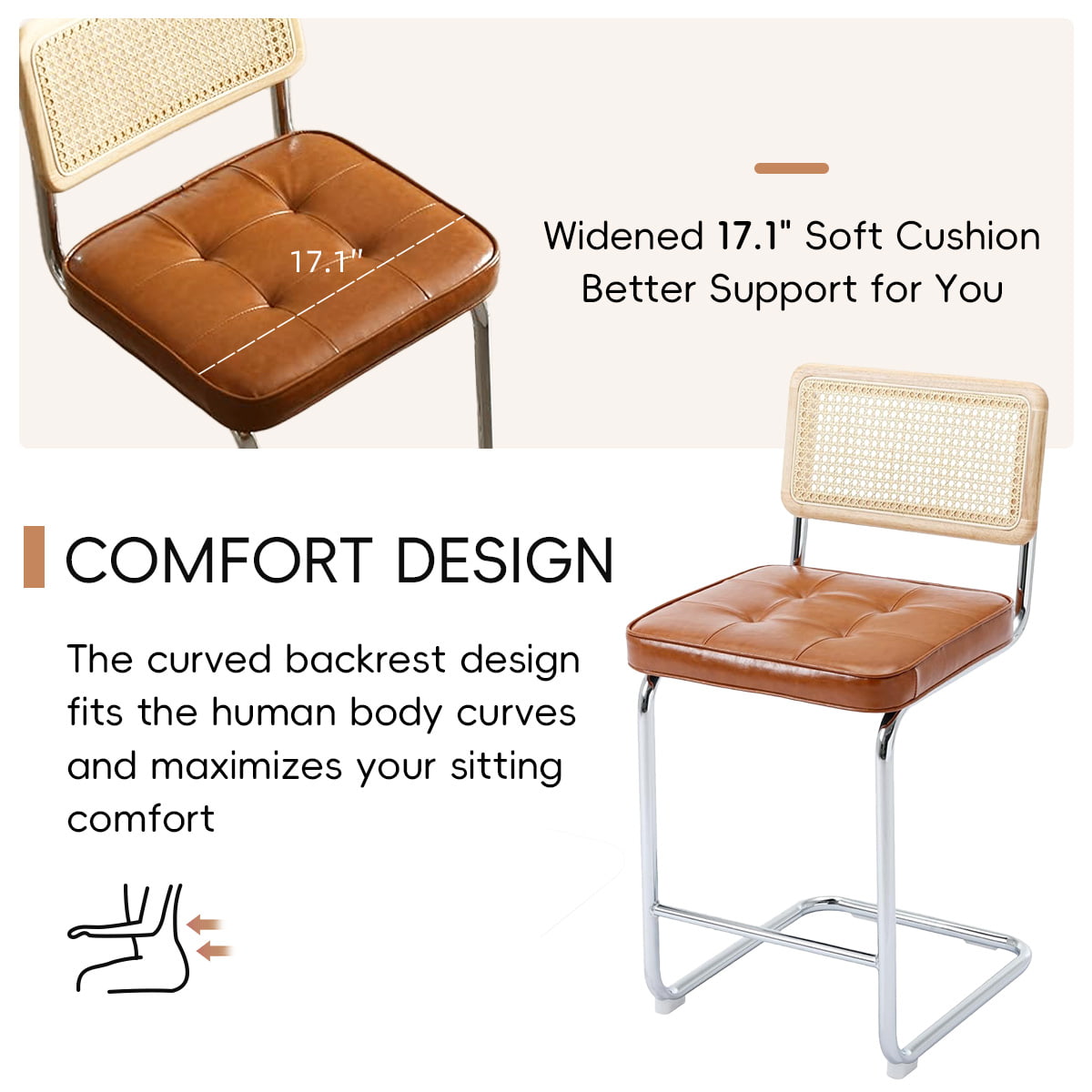 READ MOREThis low-back tufted faux leather counter stool with natural rattan back blends mid-century charm with modern durability. Featuring a handwoven cane backrest, plush high-density foam seat, and a sleek chrome steel sled frame, it delivers both style and comfort. Perfect for kitchen islands, home bars, cafés, and lounges, its breathable rattan back keeps you cool, while the 2.4-inch cushion offers lasting support. The integrated footrest and non-slip pads ensure stability and floor protection. Designed for style-conscious homeowners and commercial spaces alike, this counter stool is a versatile seating solution for any modern interior.