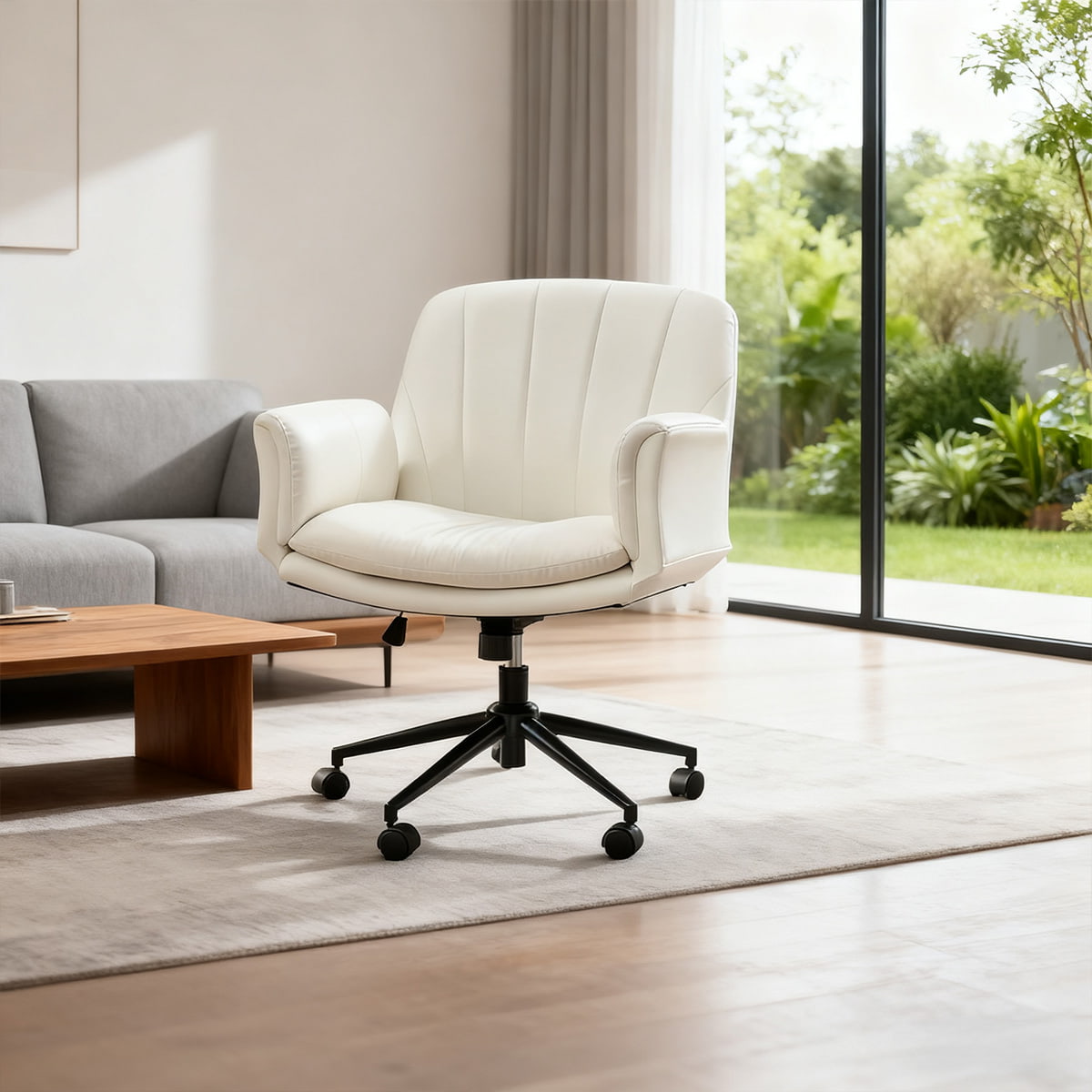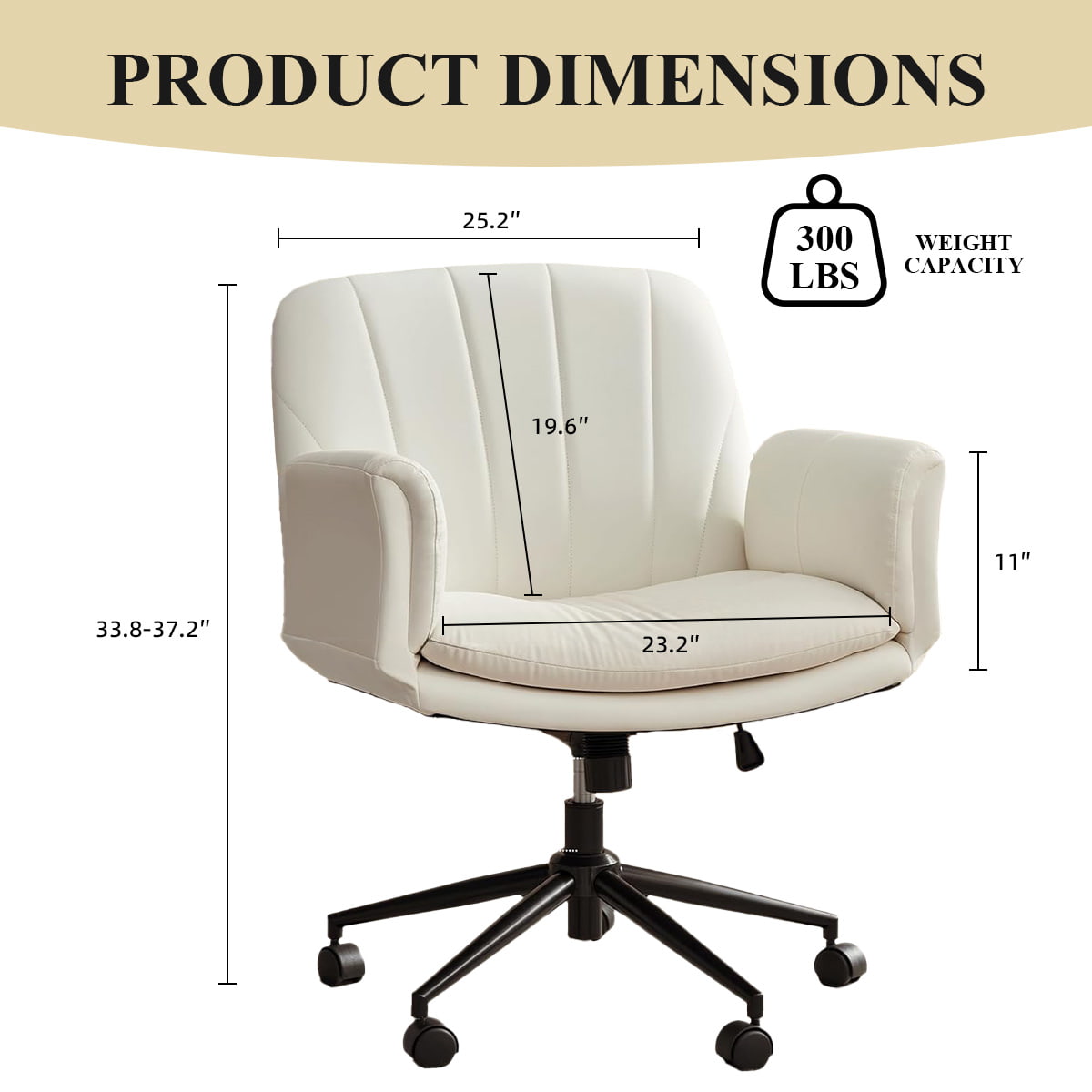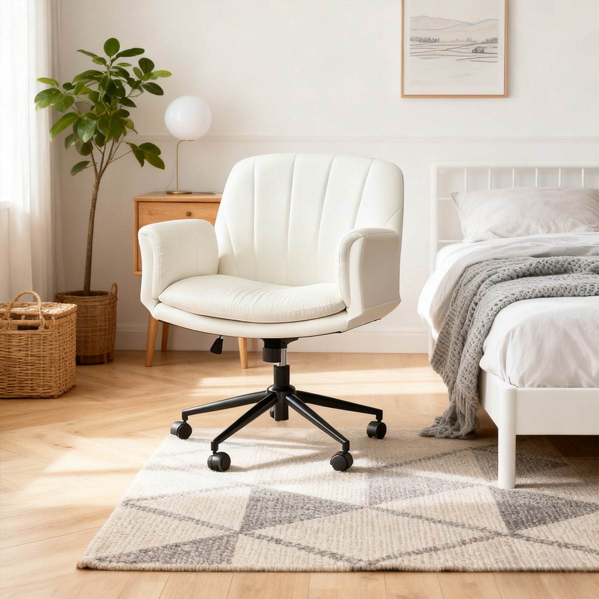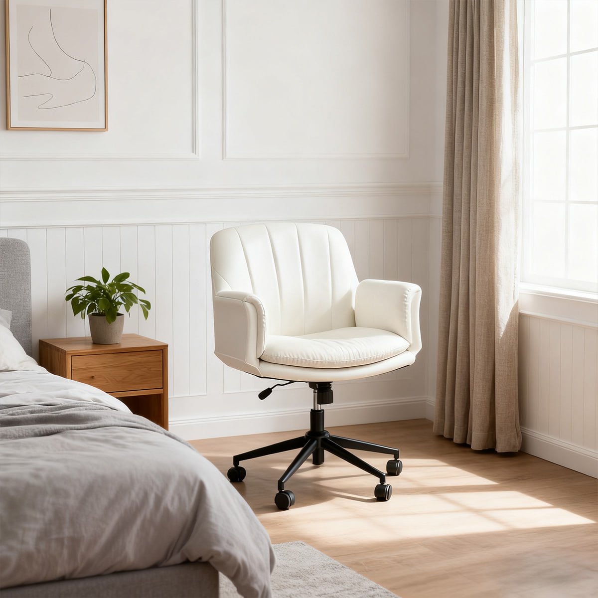 Criss Cross Adjustable PU Leather Swivel Chair with 5-Gear Armrests & Wheels——Ergonomic Vanity / Office / Makeup Chair (Milky White)
